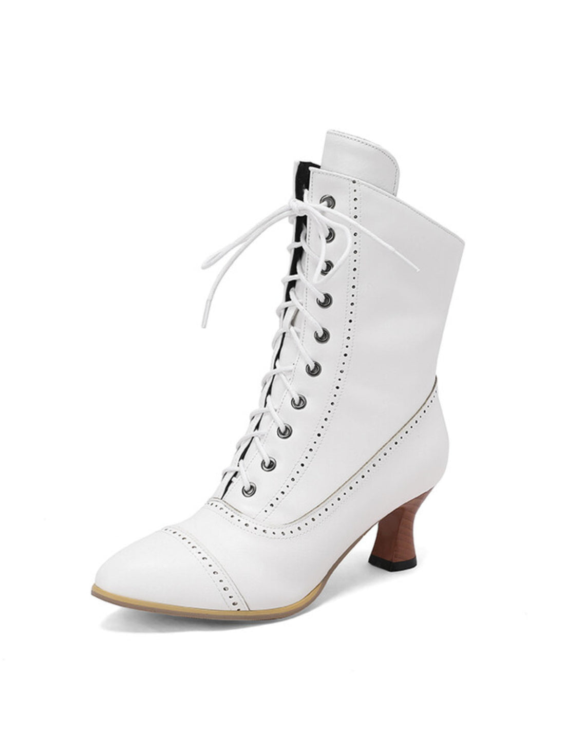 Step into timeless elegance with this vintage-inspired white lace-up mid-calf boot. Crafted with clean lines...