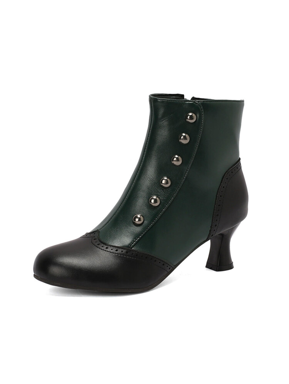 Vintage Dark Green and Black Mid Heel Button Short Boots