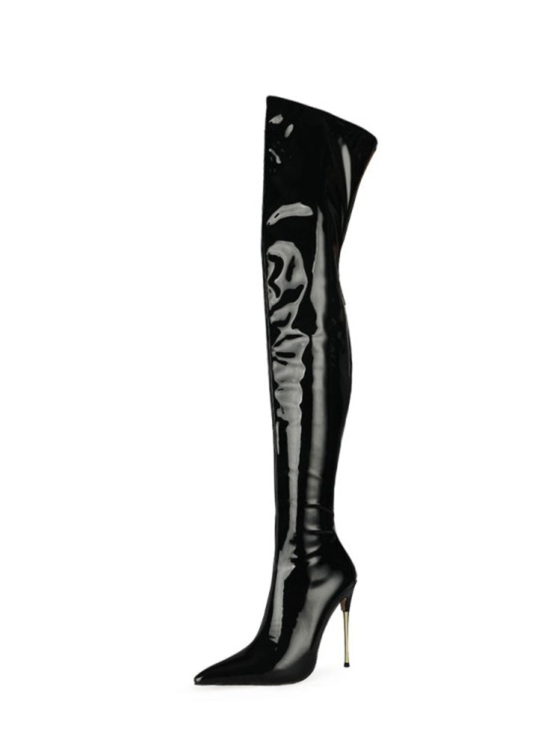 These Black Patent Leather Over The Knee Boots for Women feature a sleek slip-on design...