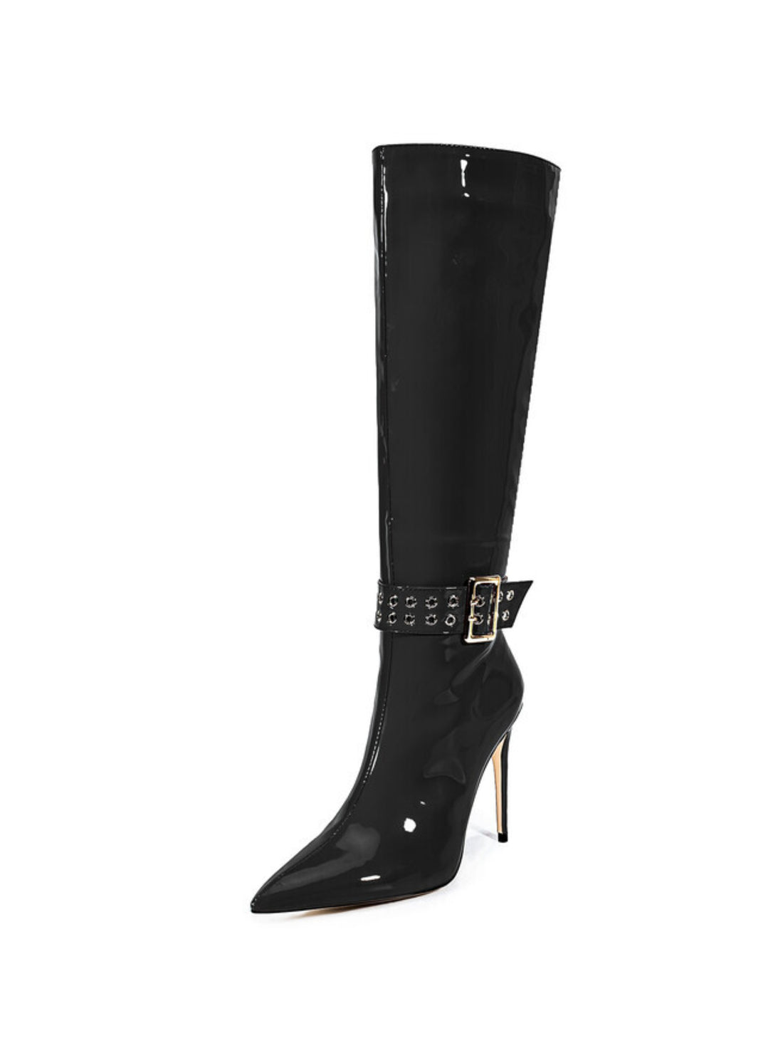 These Black Patent Leather Long Boots exude sophistication with their sleek pointed toe and slender...