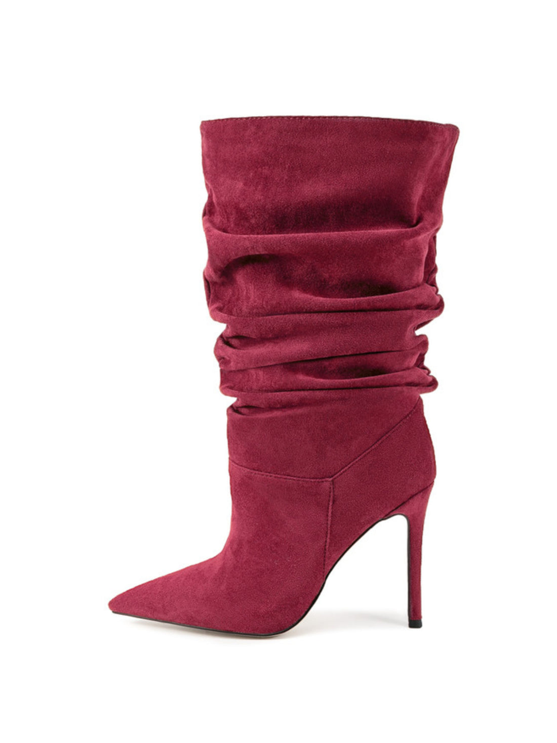 Burgundy Vegan Suede Stiletto Mid-Calf Slouch Boots Women