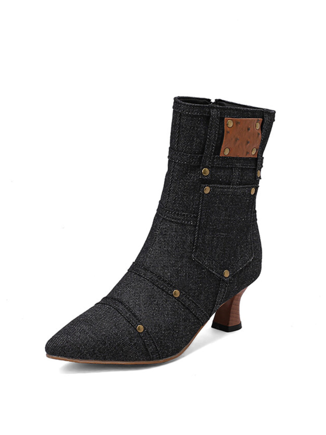 Black Denim Pocket Studded Ankle Short Boots for Women