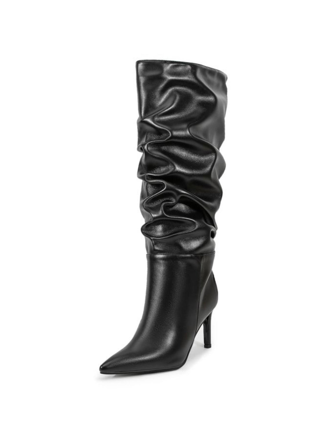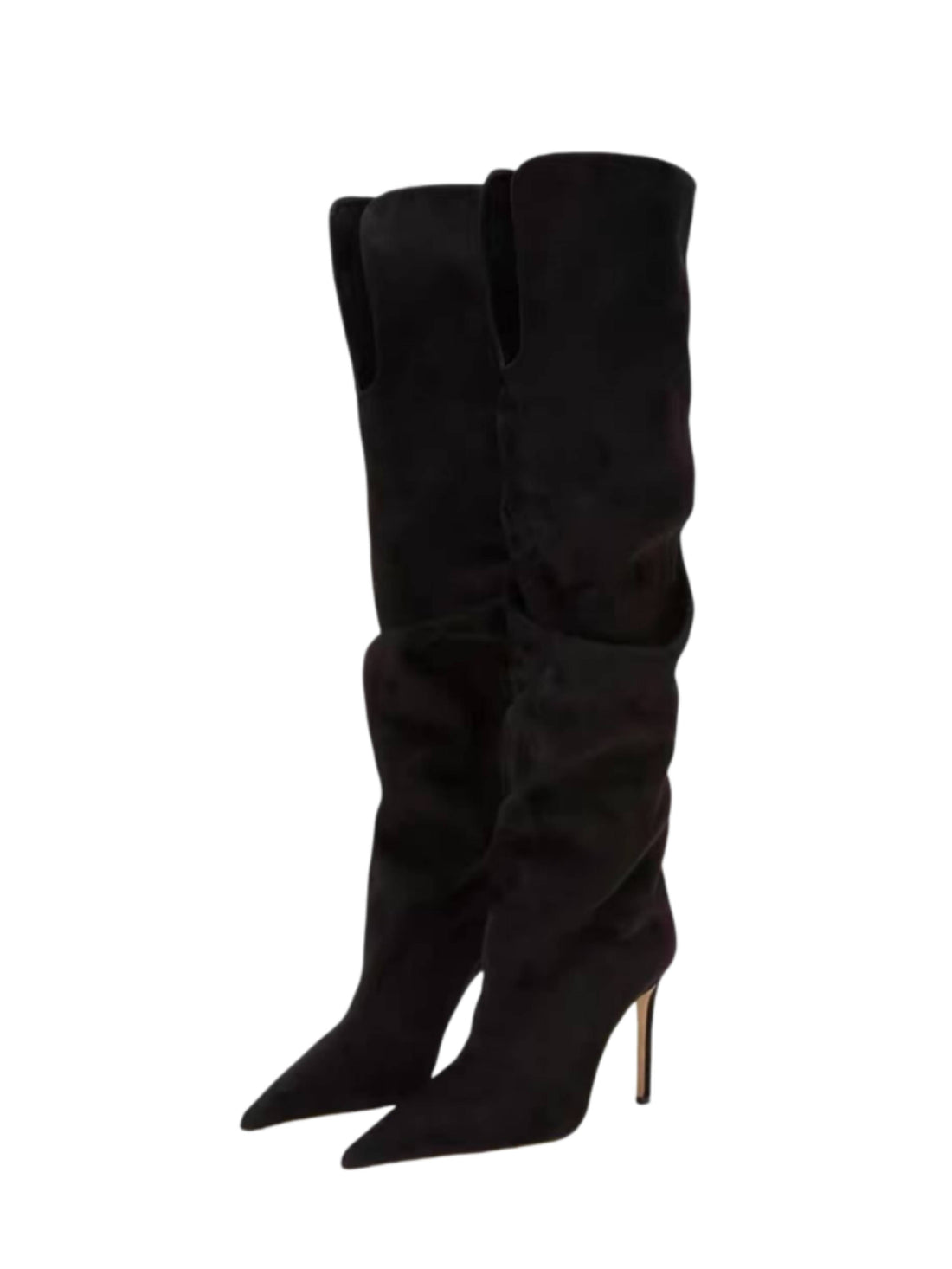 Black Slouchy Knee-High Heeled Pointed Toe Boots for Women
