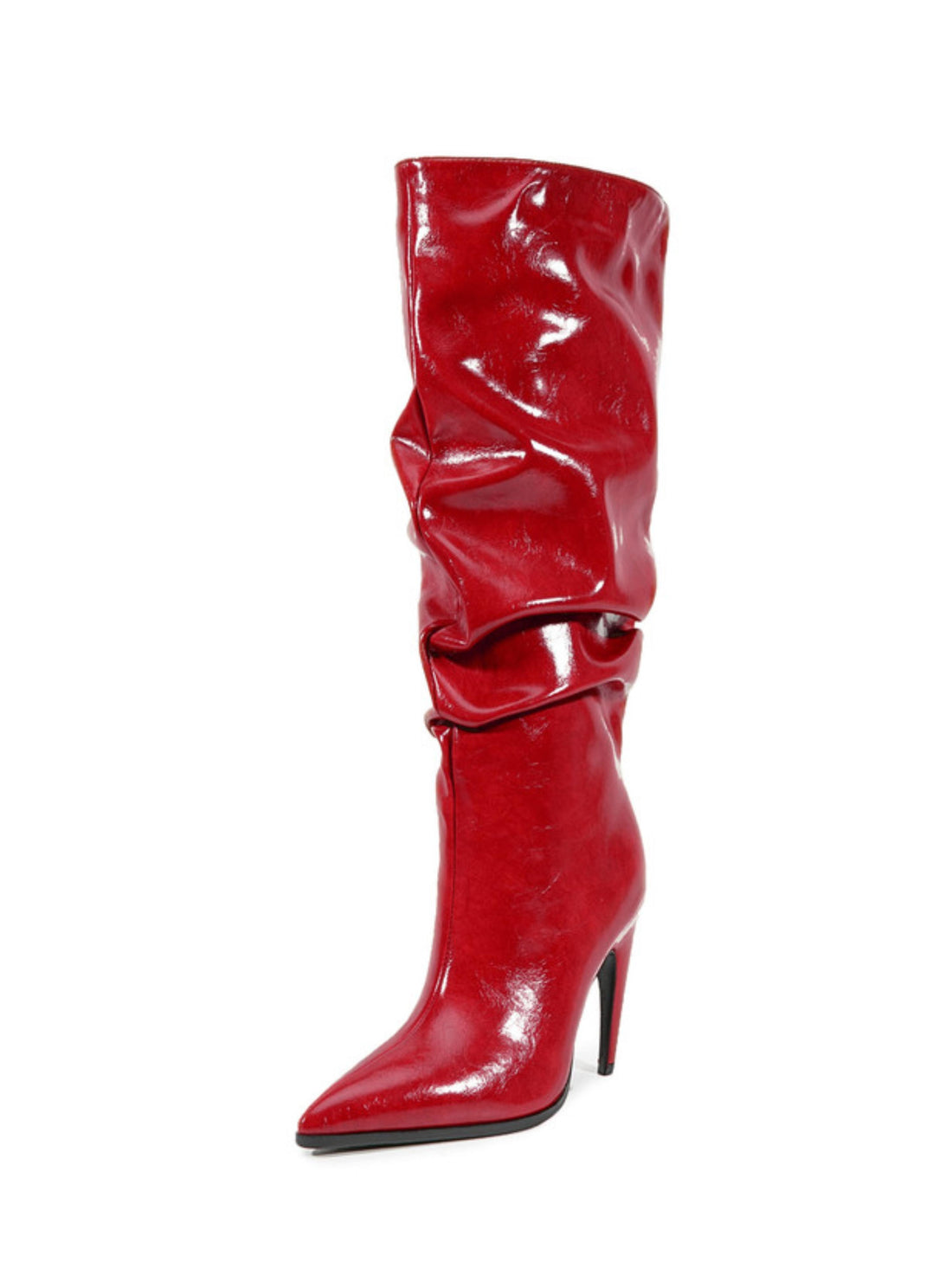 Command attention with this glossy red slouchy high-heel boot — a daring blend of glamour...
