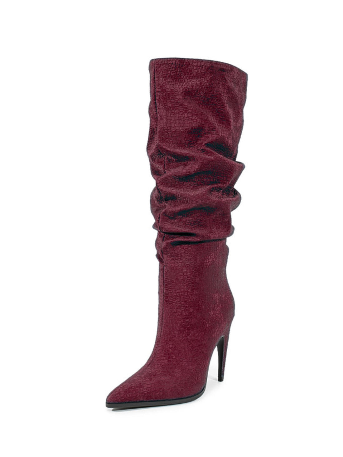 Make a refined statement with this deep burgundy slouchy high-heel boot, blending luxury and bold...