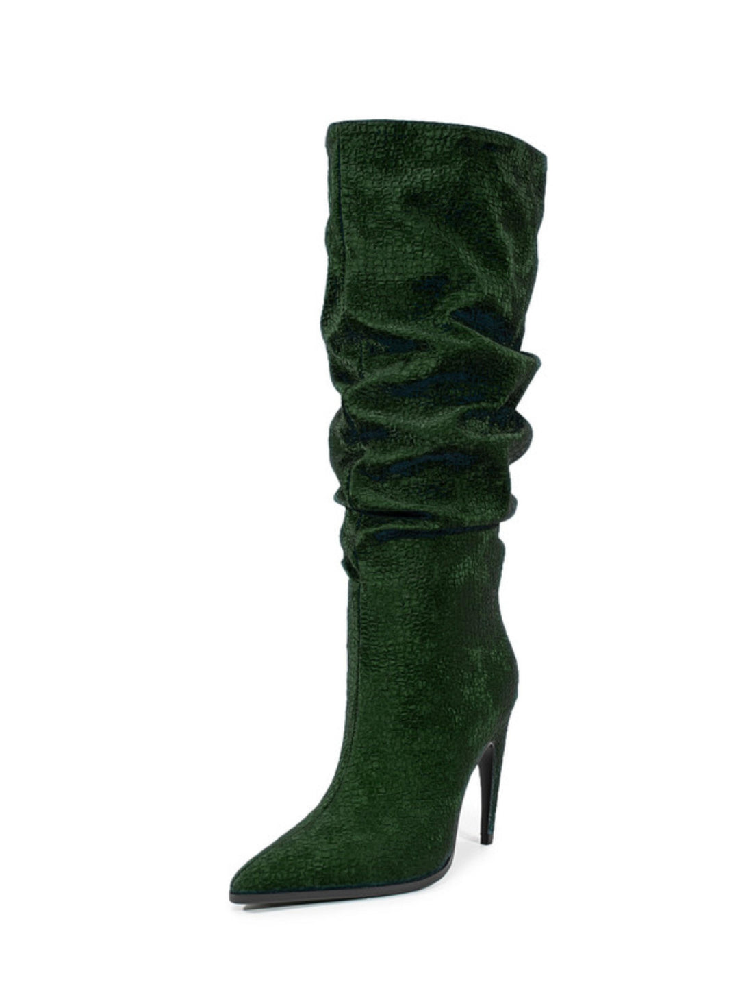 Step into refined allure with this dark forest green slouchy high-heel boot. Its deep, rich...