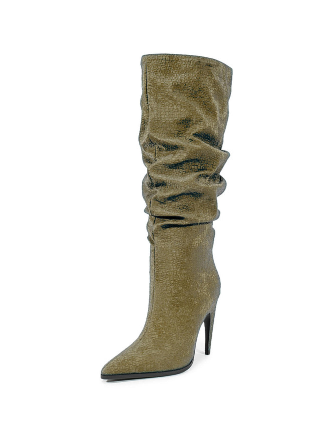 Embrace earthy sophistication with this olive green slouchy high-heel boot. The soft, textured finish and...