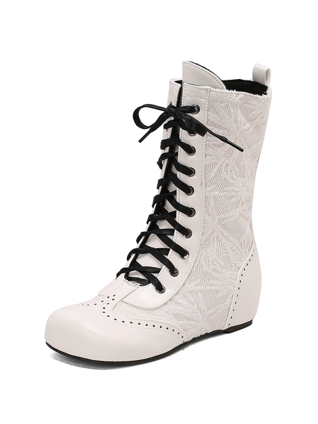 Vintage White Low-Heel Round Toe Lace-Up Boots