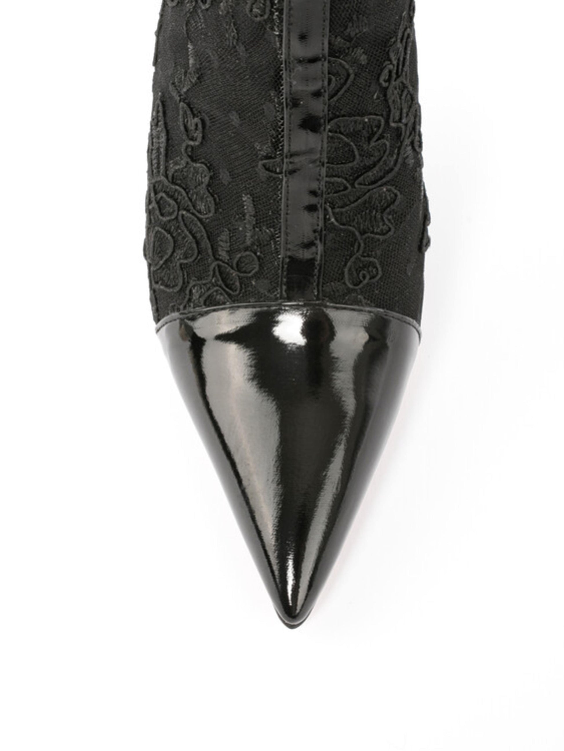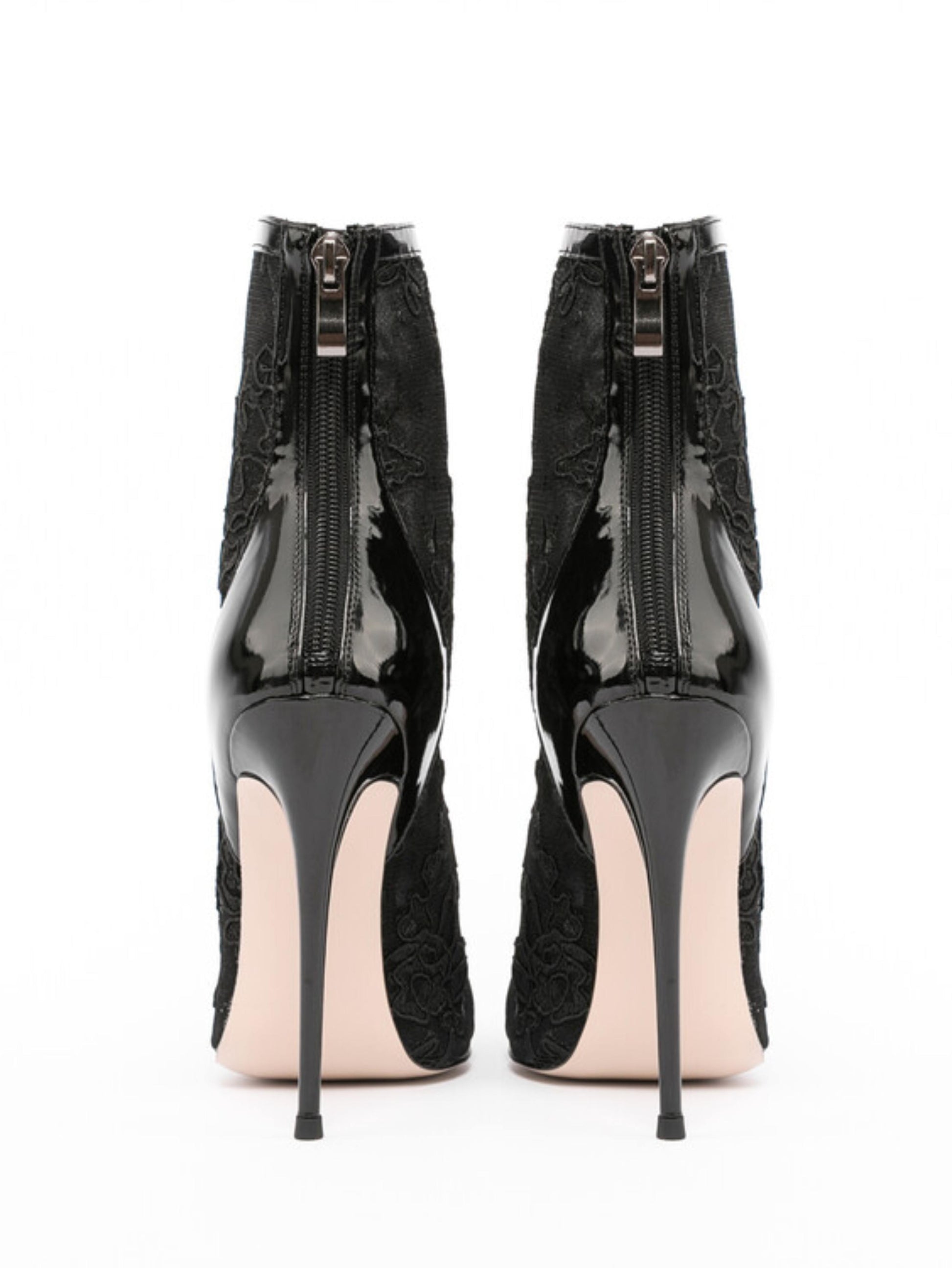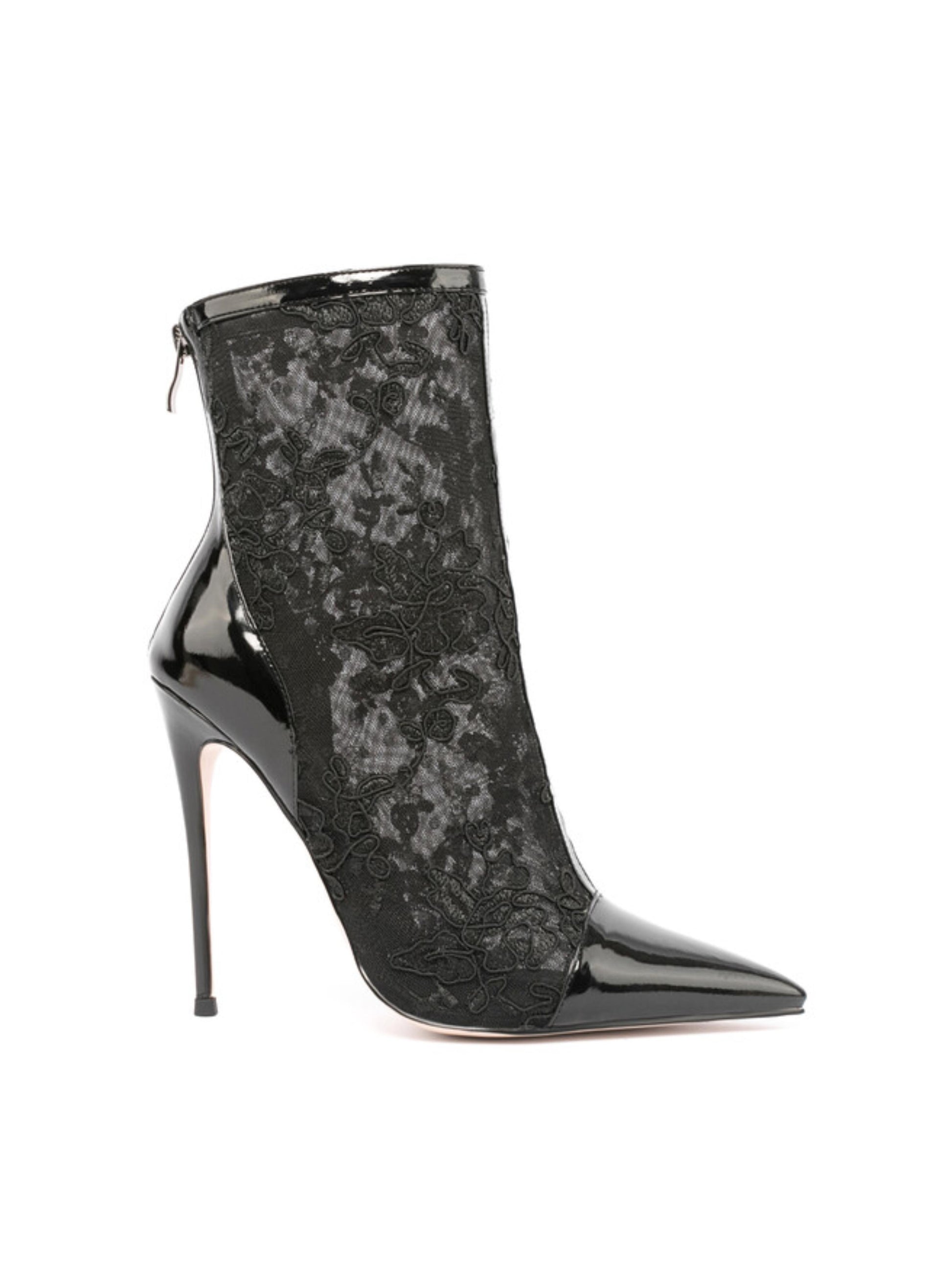 These exquisite black ankle boots combine elegance and sensuality through a stunning mix of glossy patent leather and delicate floral lace. The sleek pointed toe and high stiletto heel create a refined, elongated silhouette that exudes sophistication. Perfect for evening wear or statement outfits, these boots blend luxurious textures with bold femininity, making them an unforgettable fashion piece..