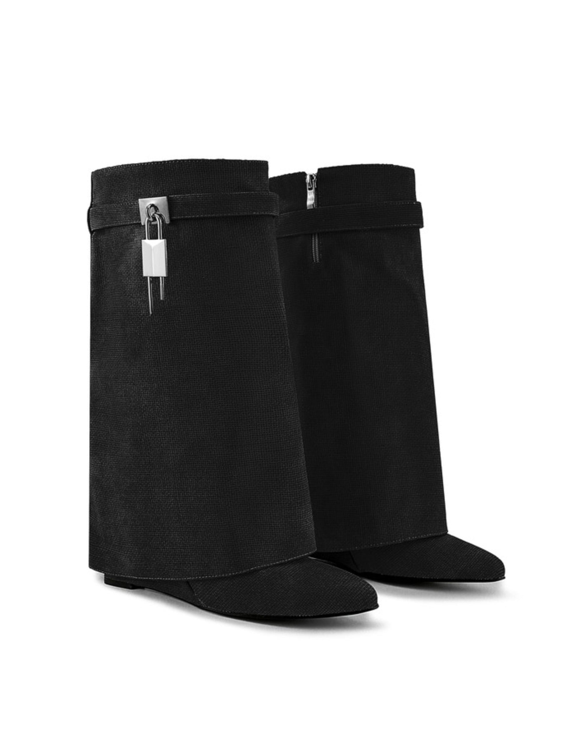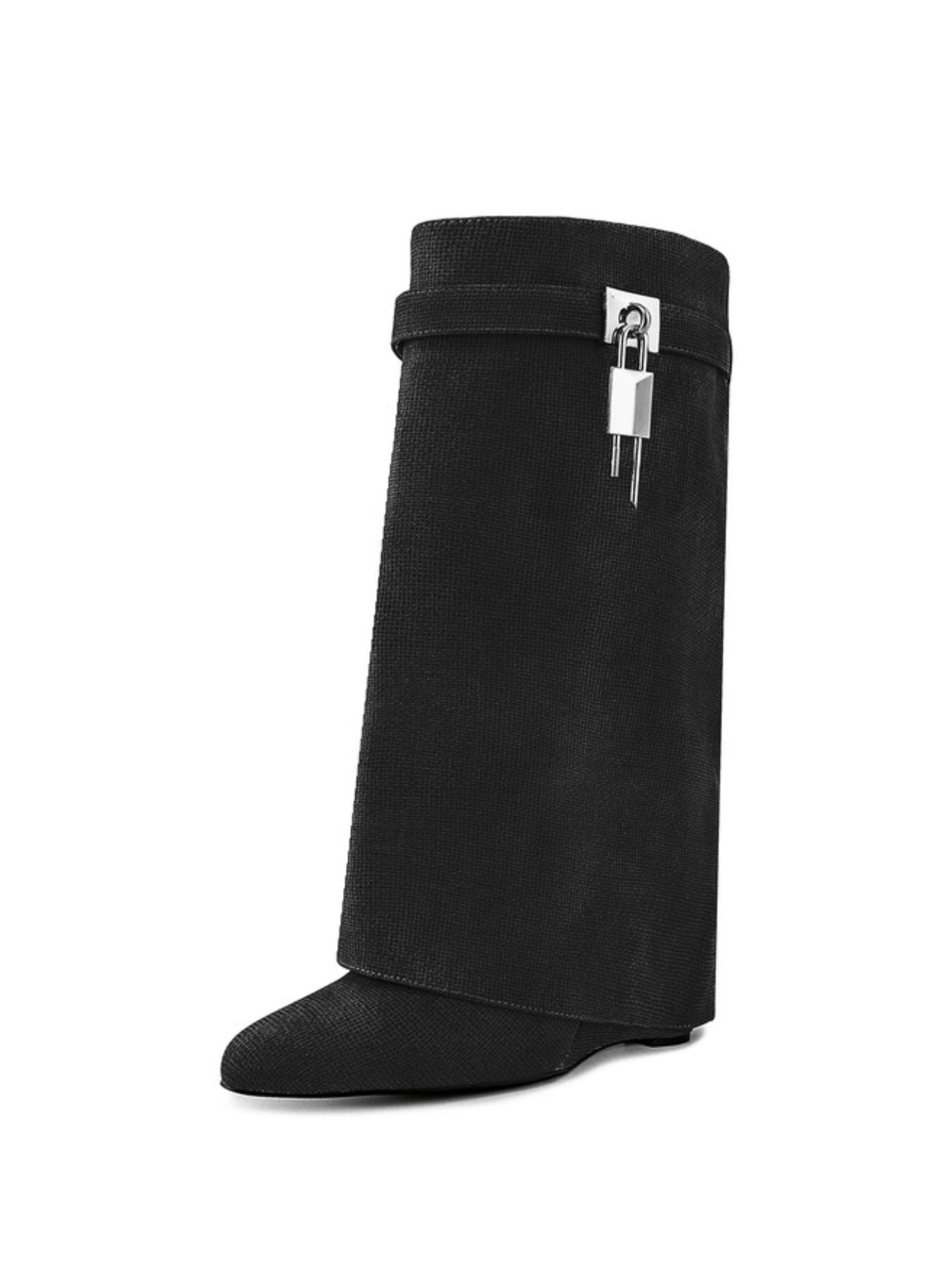Black Fold Over Mid-Calf Lock Decor Wedge Boots