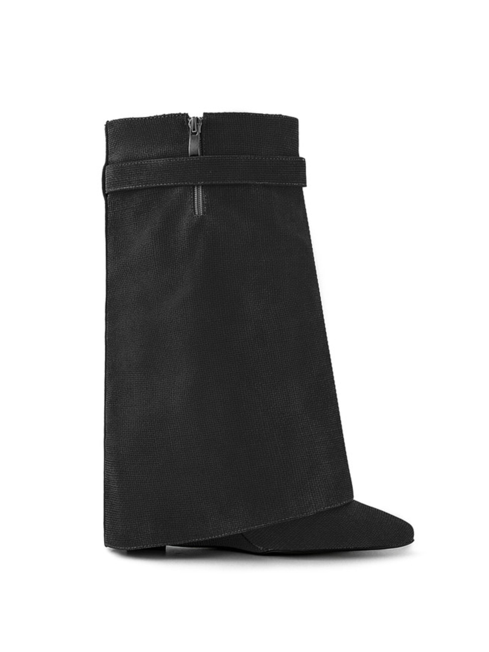 Make a bold fashion statement with these Black Mid-Calf Fold Over Wedge Boots. These boots blend avant-garde aesthetics with everyday wearability. The silver-tone hardware detail adds a touch of sophistication, while the smooth faux leather finish gives them a sleek, modern appeal. Perfect for elevating both casual and dressy outfits.