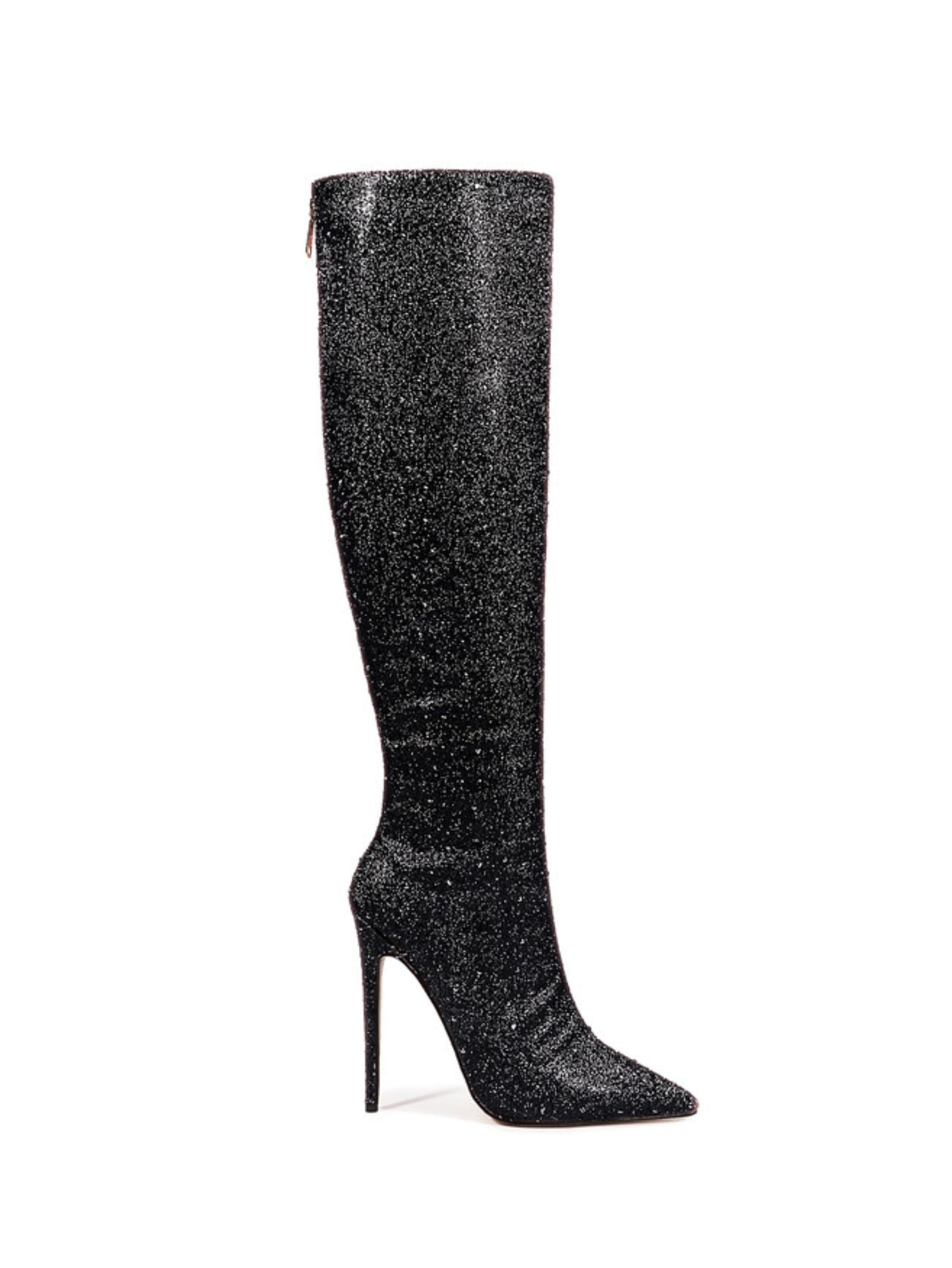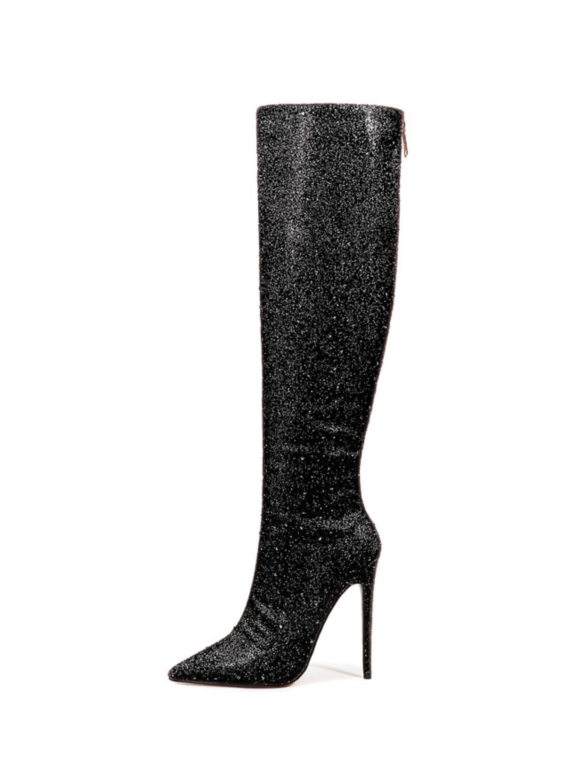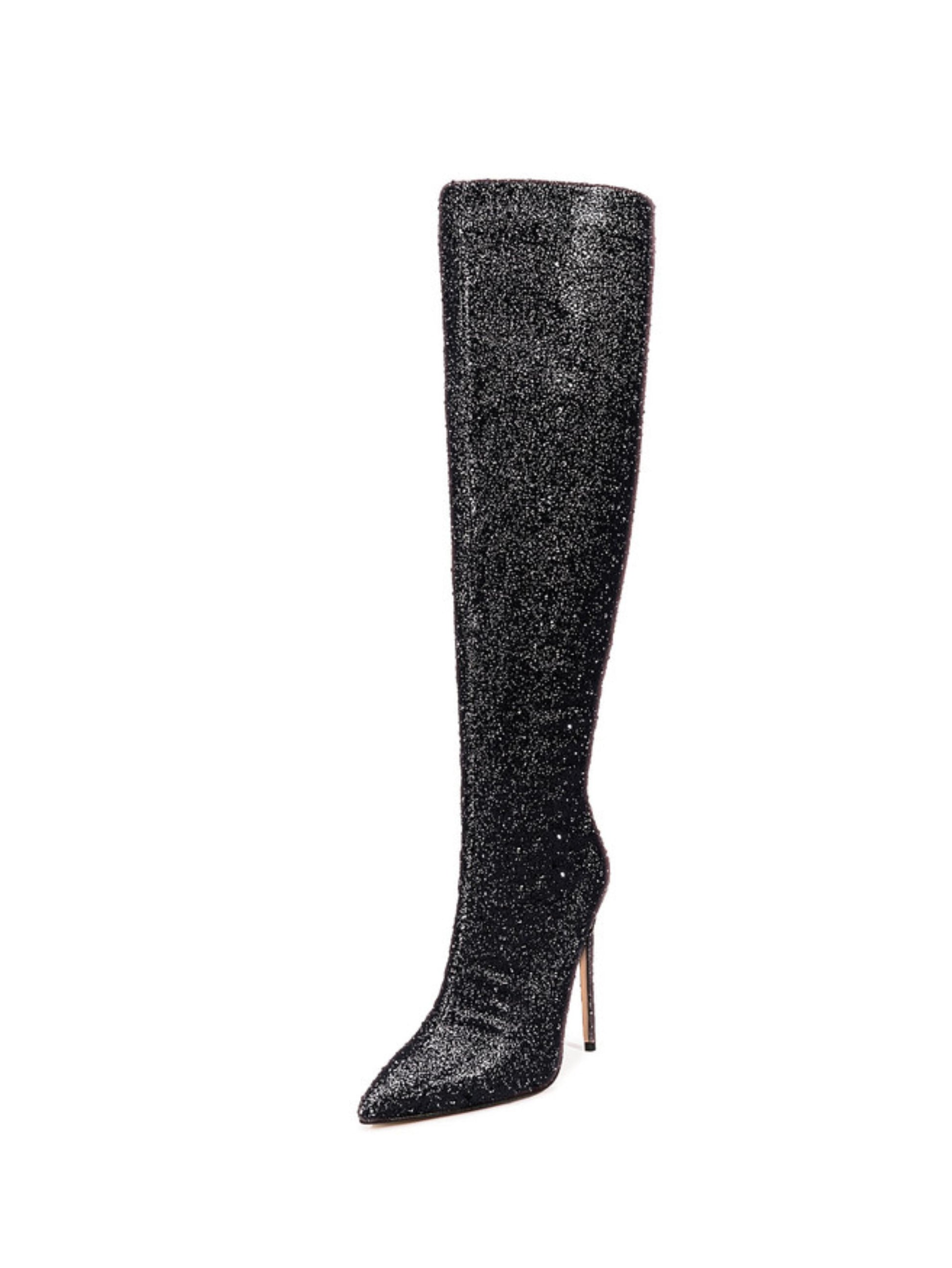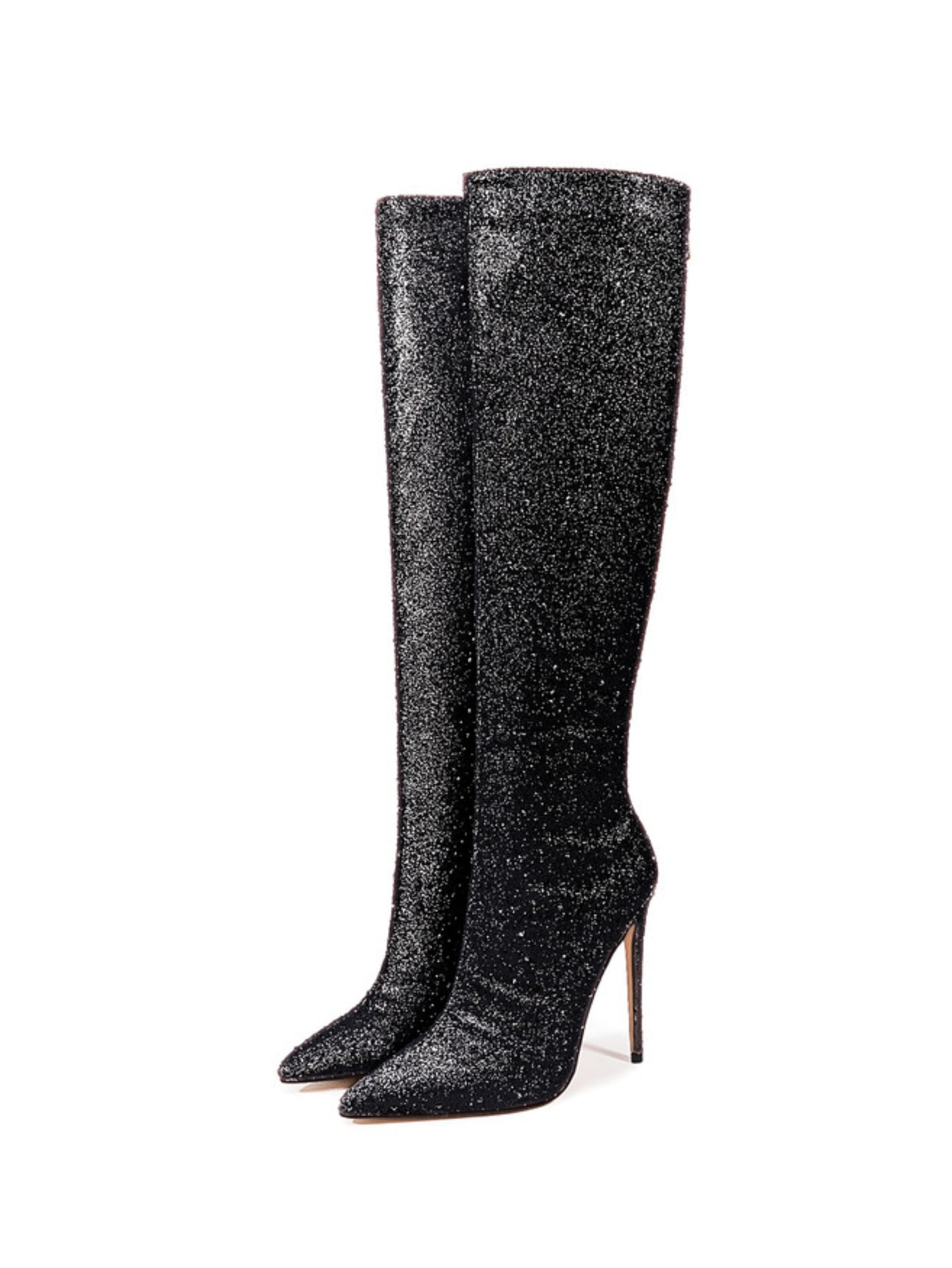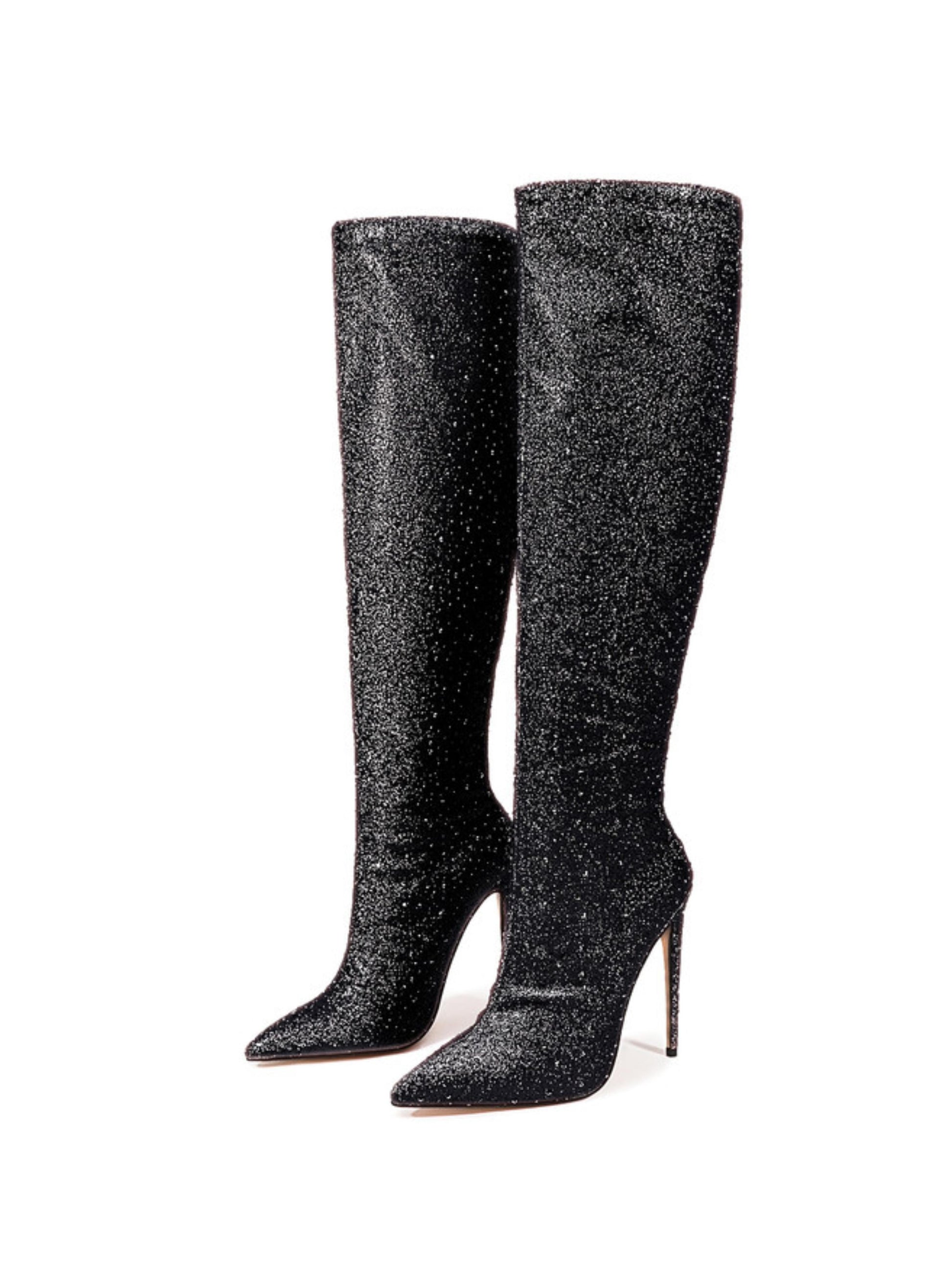 Step into the spotlight with these Black Glitter Pointed Toe Long Boots! Featuring an ultra high stiletto heel and a sleek back zipper, they bring sparkle and sass to every stride. Perfect for turning heads and adding a glamorous touch to your look, these boots make any outfit shine bright.