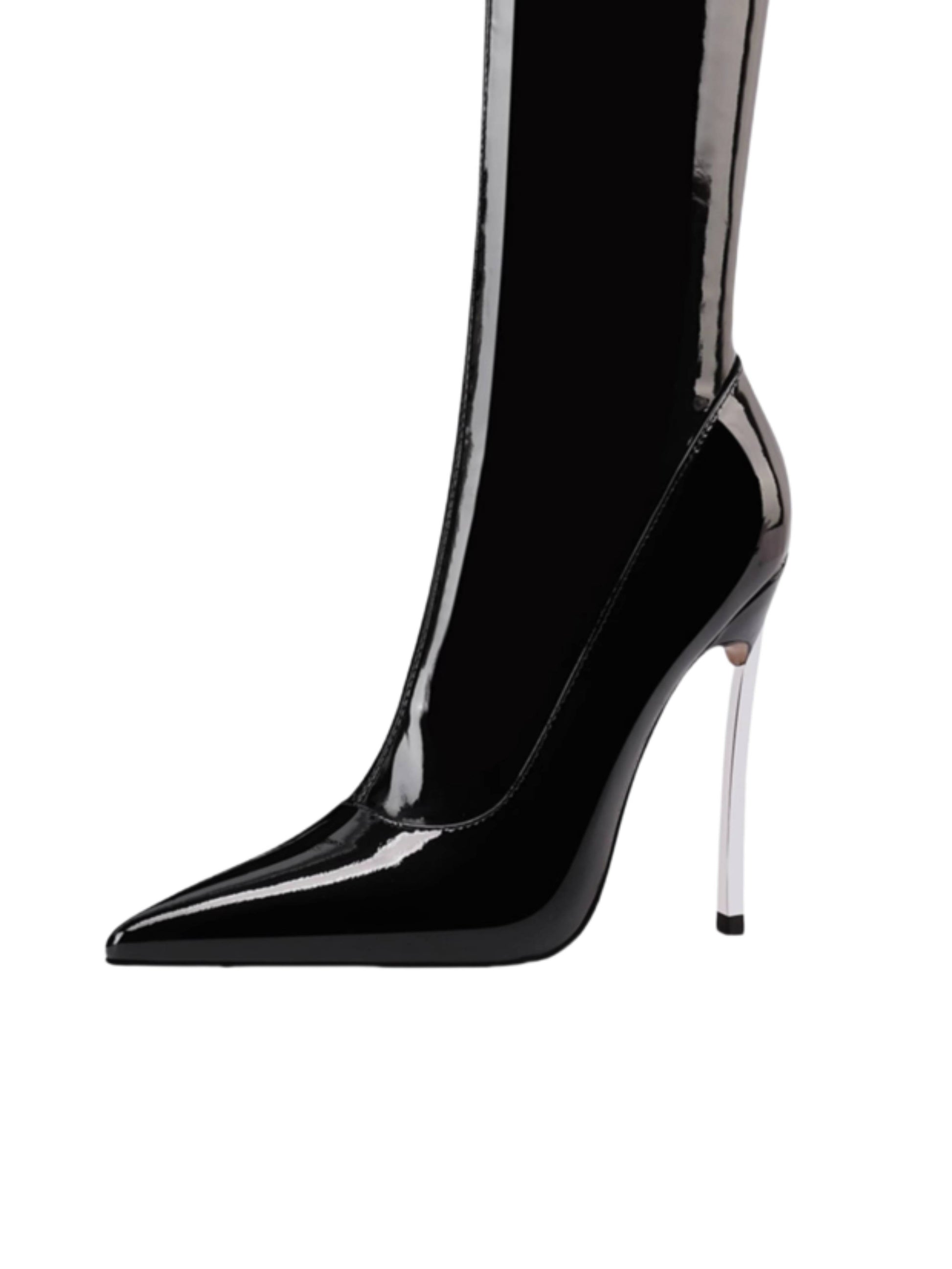Sleek, powerful, and undeniably chic — these black patent thigh-high boots are a wardrobe essential for anyone who loves bold sophistication. The mirror-like shine and sculpted stiletto heel create a confident, runway-ready look that pairs effortlessly with dresses, skirts, or statement outerwear.