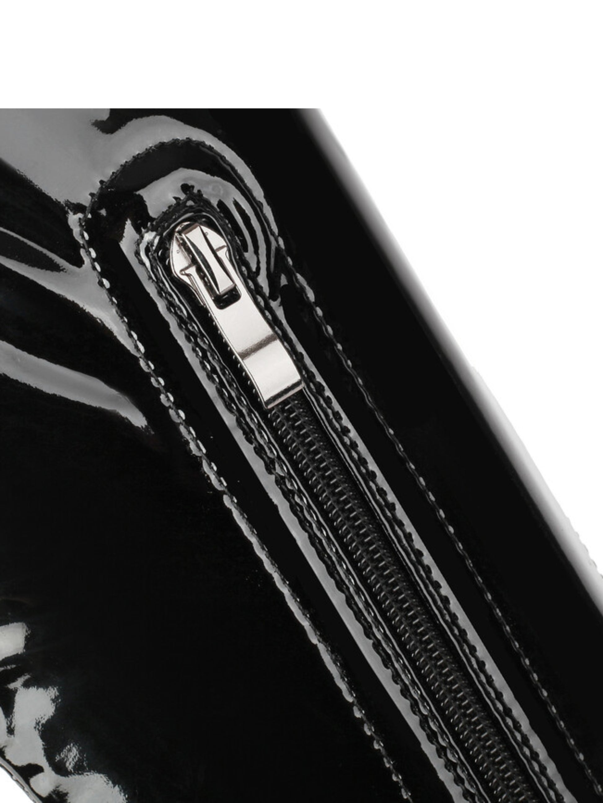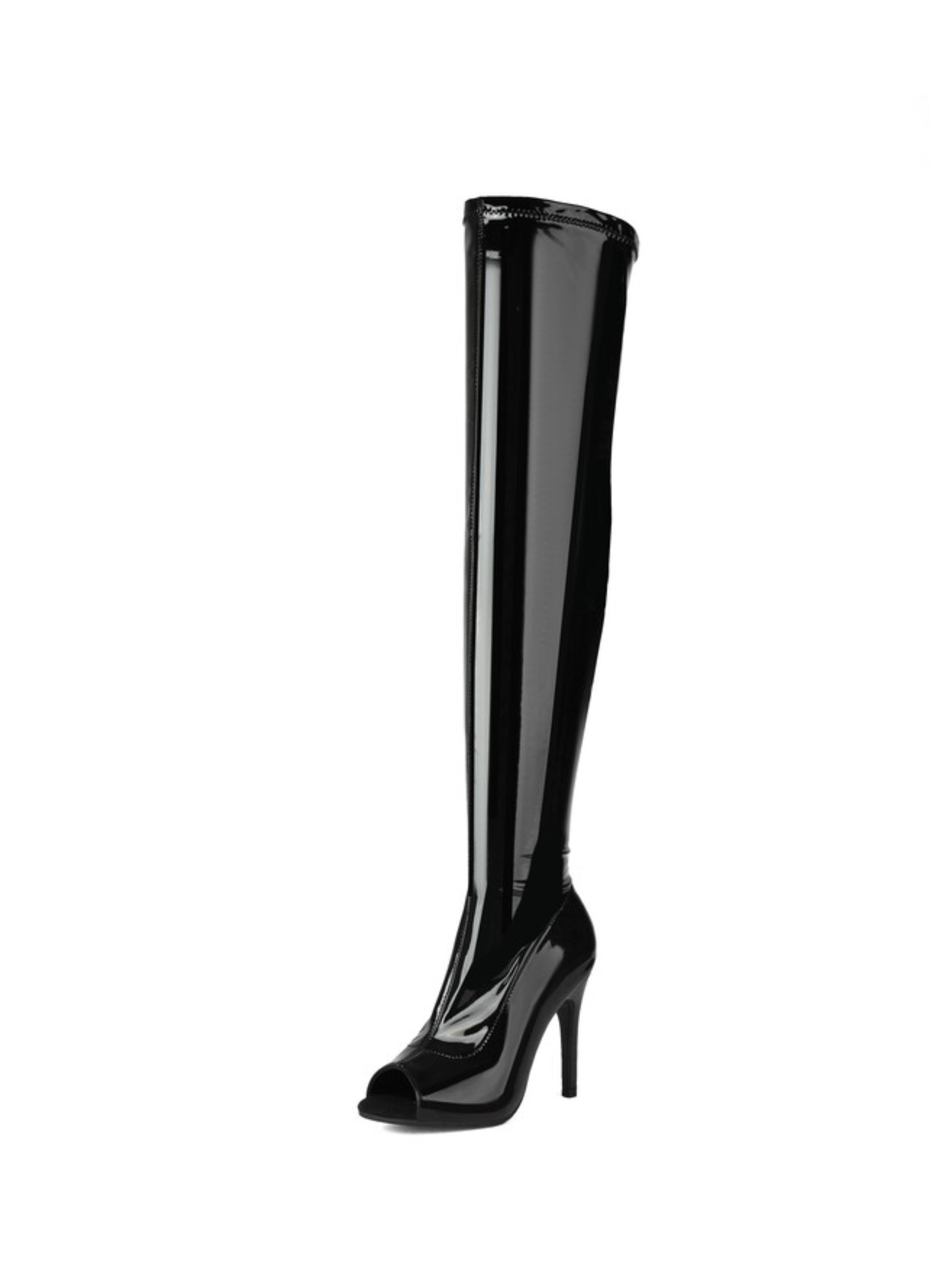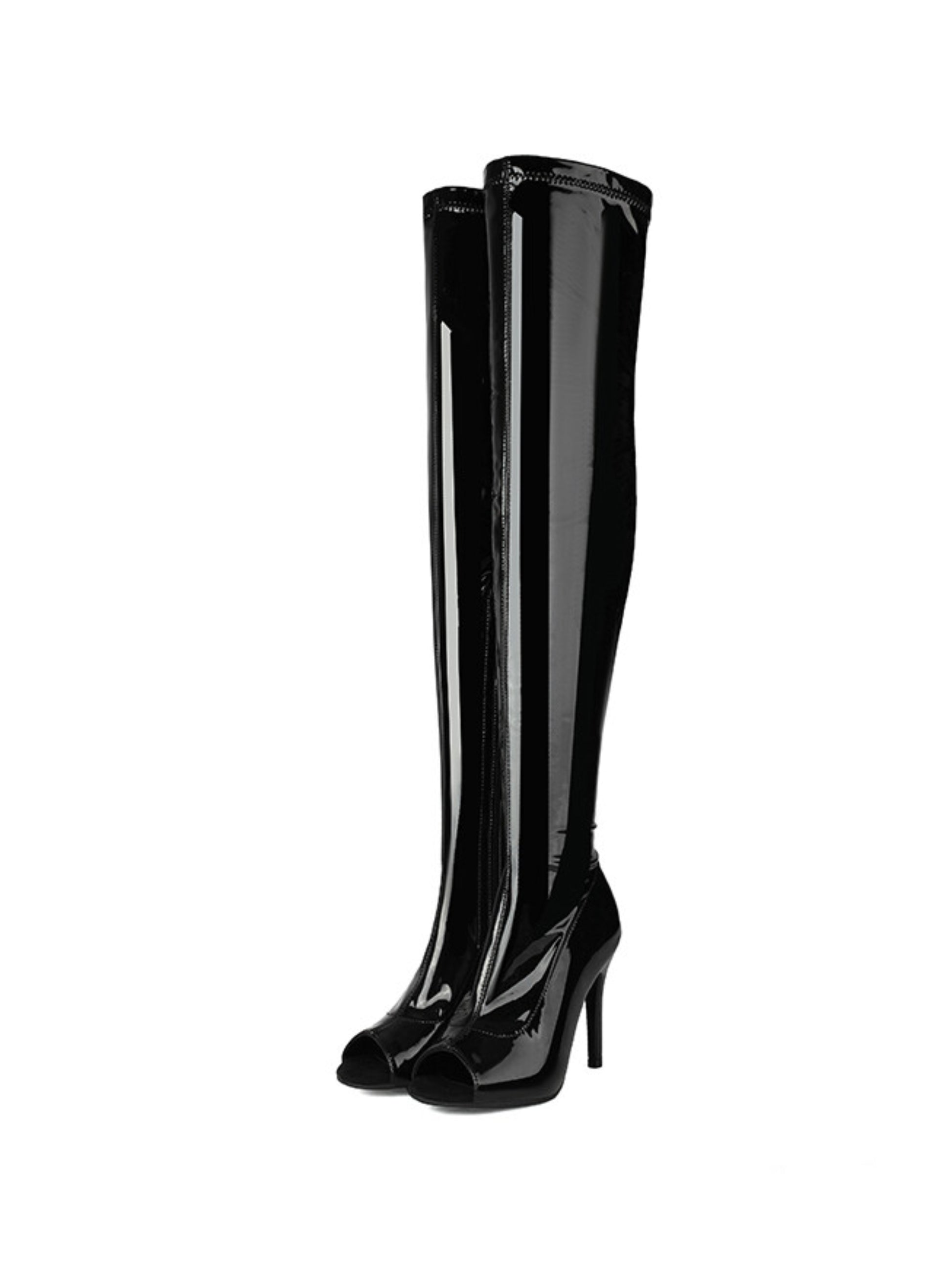 Make a bold statement with these stunning Black Peep Toe Heeled Thigh High Boots. Crafted from luxurious patent leather, these show-stopping boots feature a sleek stiletto heel that elongates your silhouette while the peep toe adds an alluring touch of sophistication. The convenient slip-on design paired with a side zipper ensures effortless styling without compromising on elegance. Perfect for elevating any outfit, from evening wear to special occasions, these thigh-high boots deliver confidence and glamour with every step.