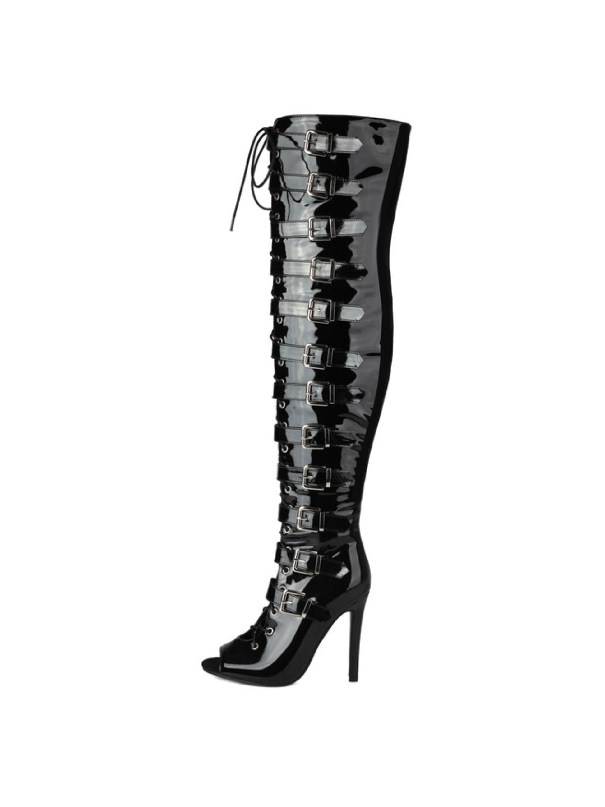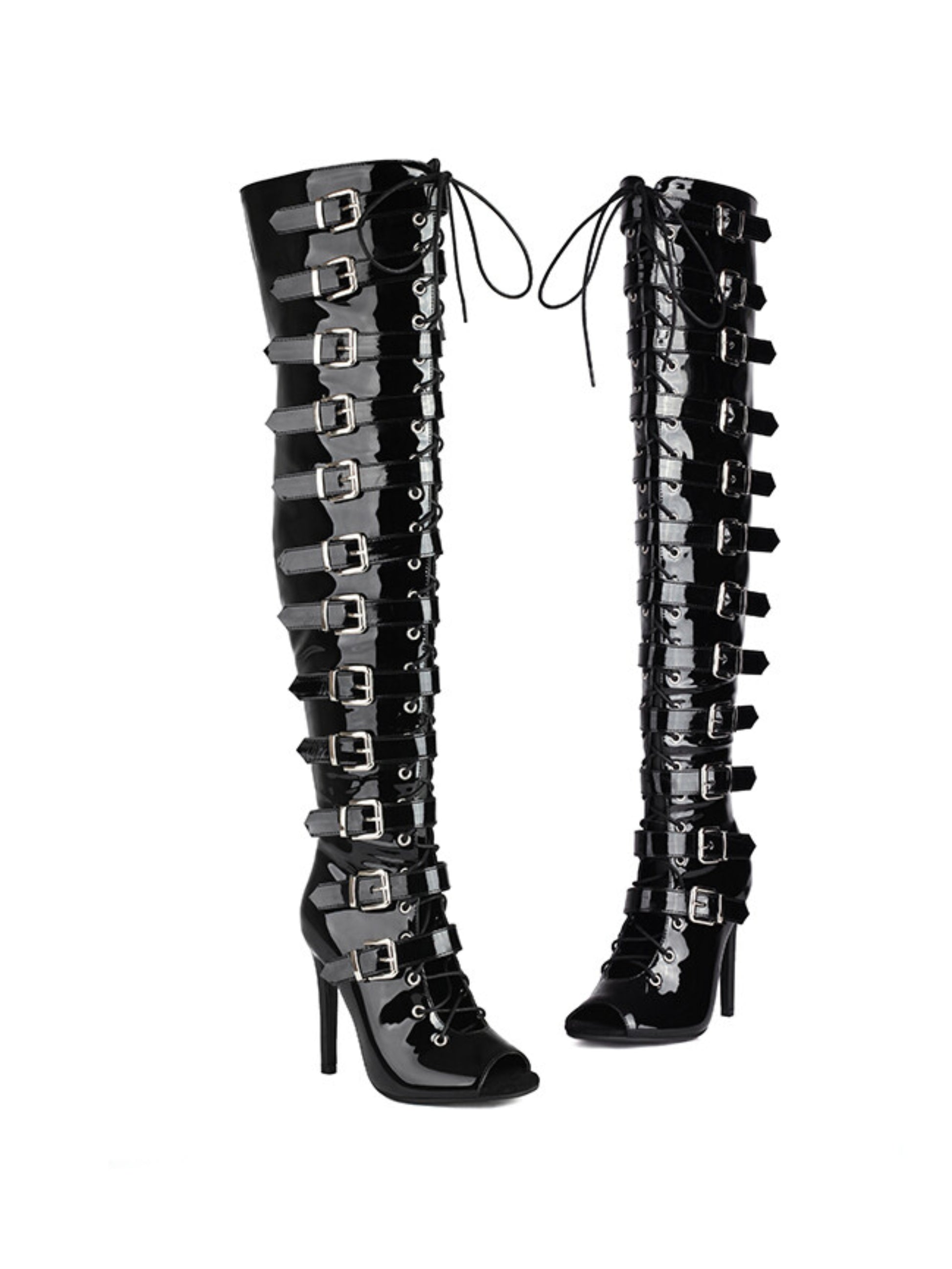 Black Peep Toe Lace-Up Buckled Over-The-Knee Boots Women