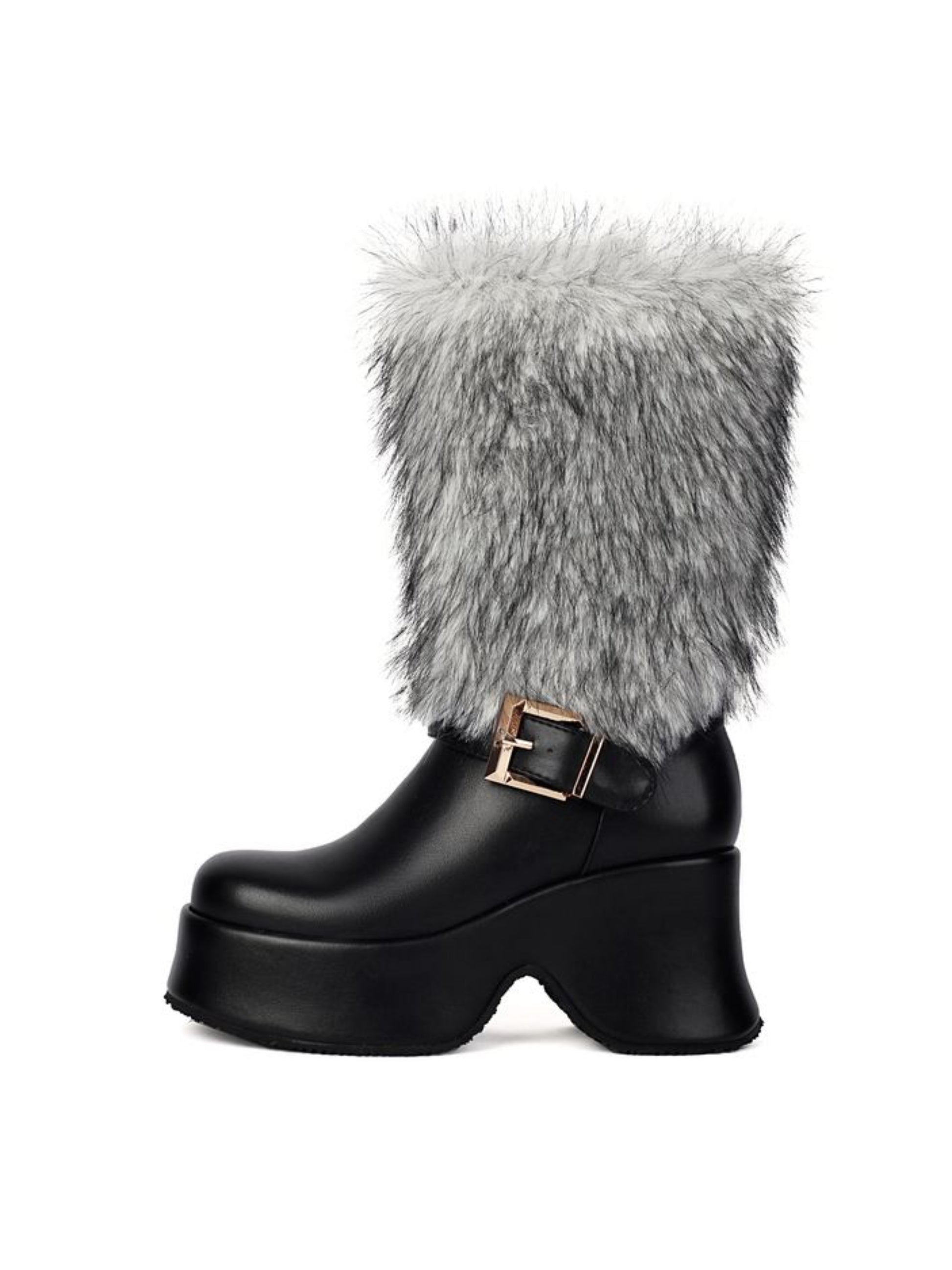 Black Platfotm Heel Buckled Mid Calf Boots for Women