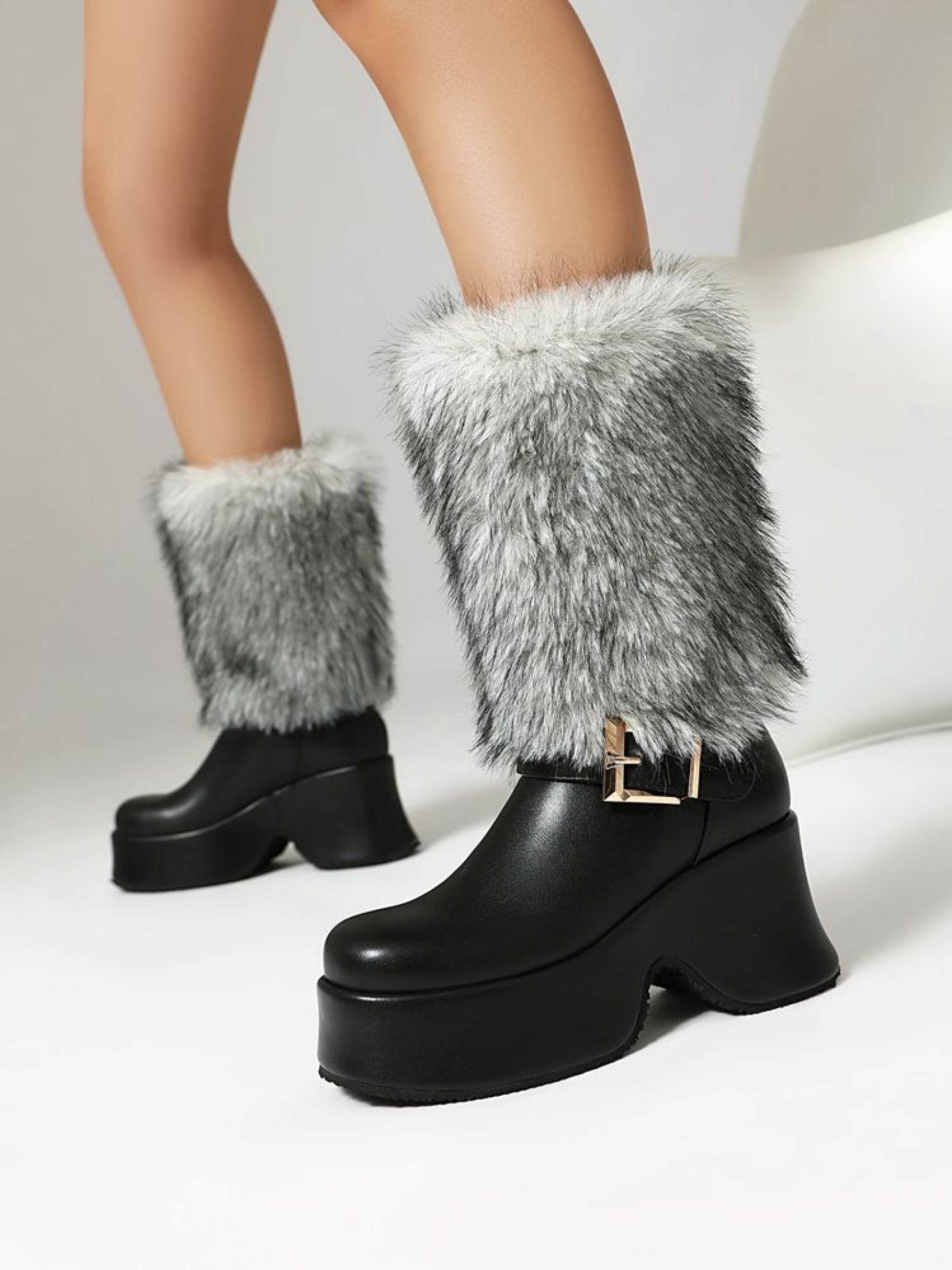 Step into effortless elegance with these black slip-on heeled long boots, designed for the modern woman. Crafted from premium faux leather with plush fur detailing along the top, they deliver warmth and sophistication through winter months. The convenient slip-on design features decorative buckle accents below the calf, while the square toe and platform heel provide both comfort and a contemporary silhouette. A versatile essential that transitions seamlessly from casual outings to evening occasions.