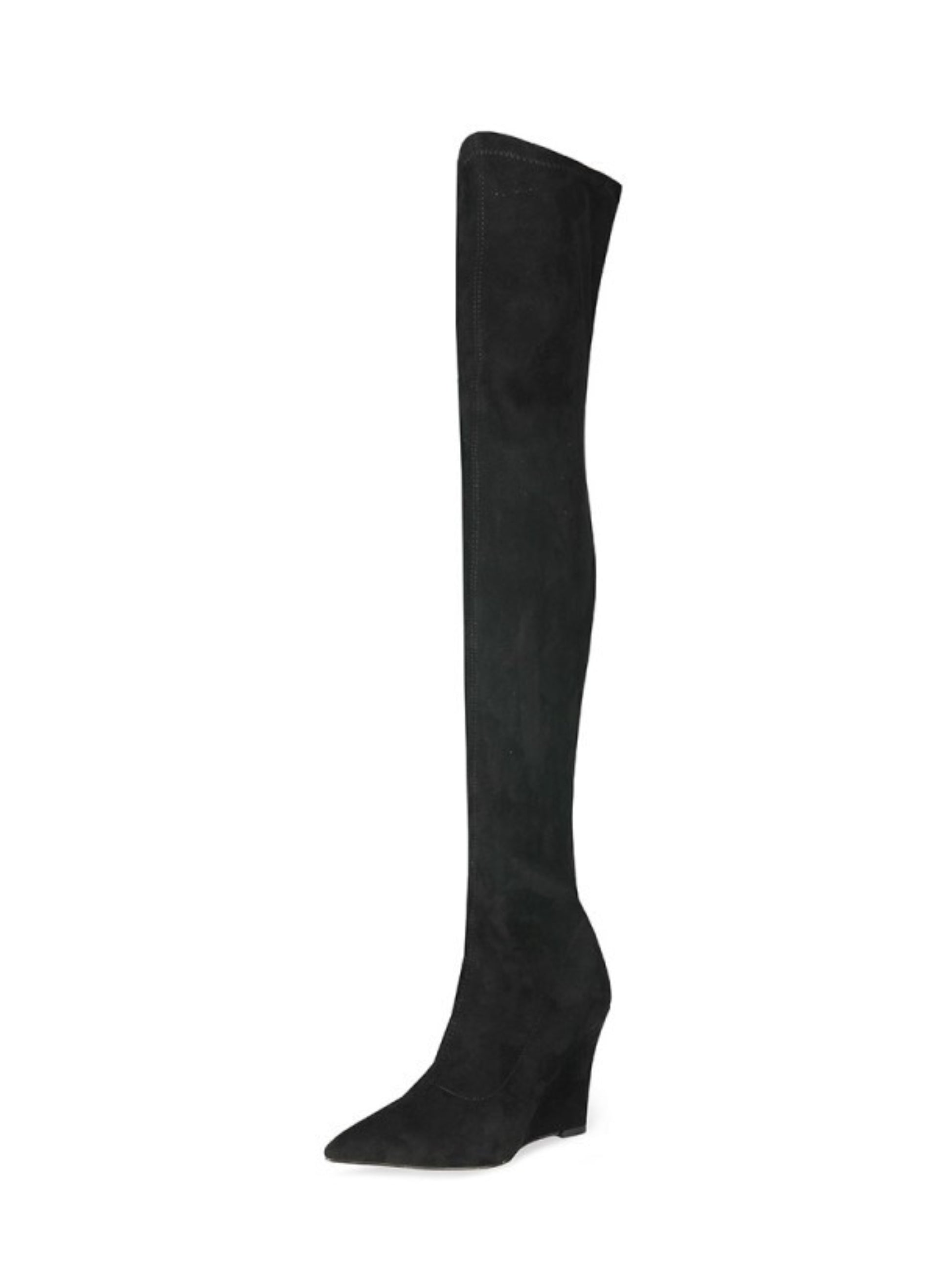 Experience both style and comfort with these Black Over-The-Knee Boots crafted from soft faux suede. Featuring a pointed toe and a high wedge heel, they provide stable elevation while maintaining a sleek silhouette. The slip-on design ensures easy wear and a secure fit, making these boots a reliable choice for all-day confidence and sophistication.