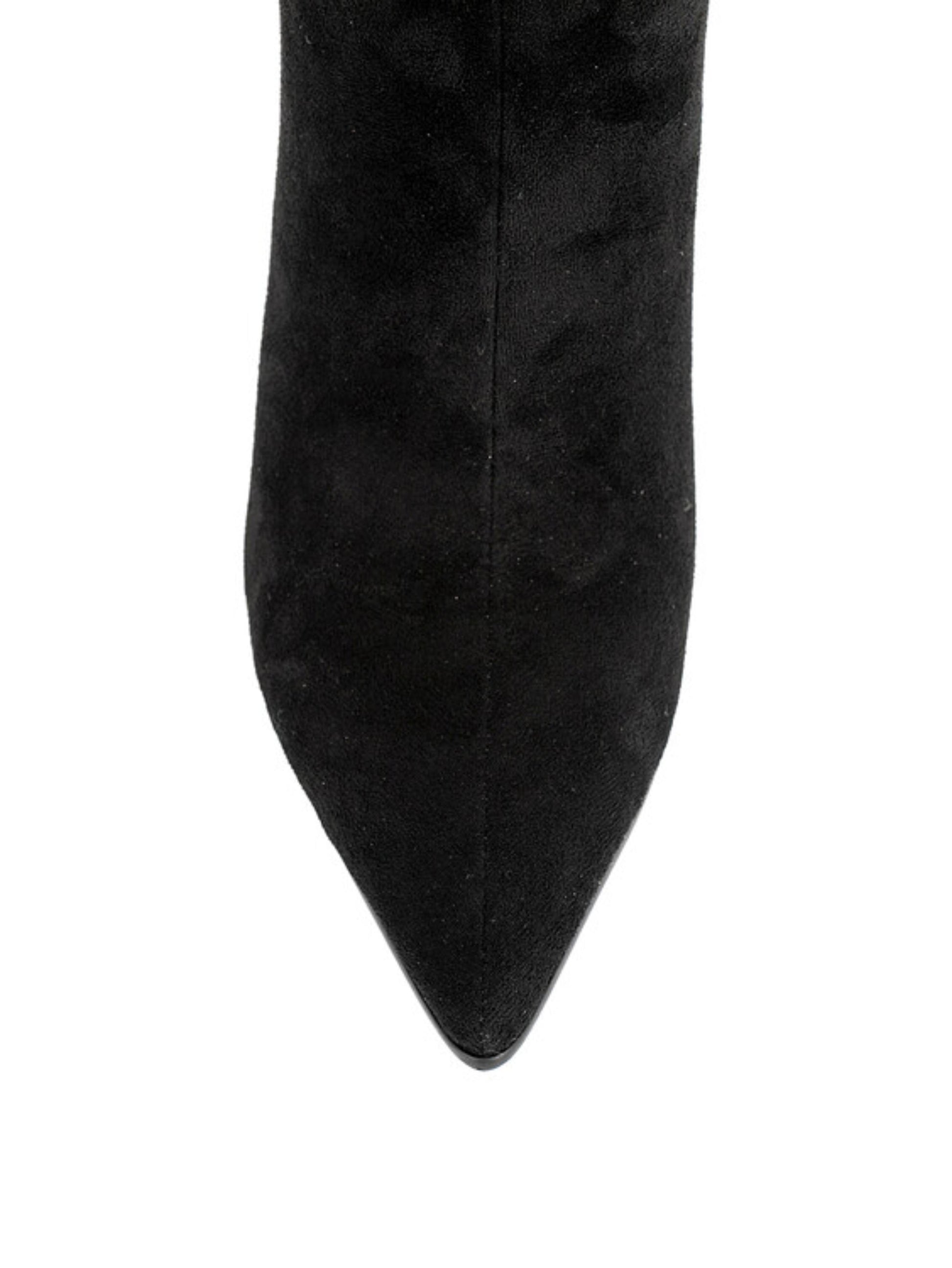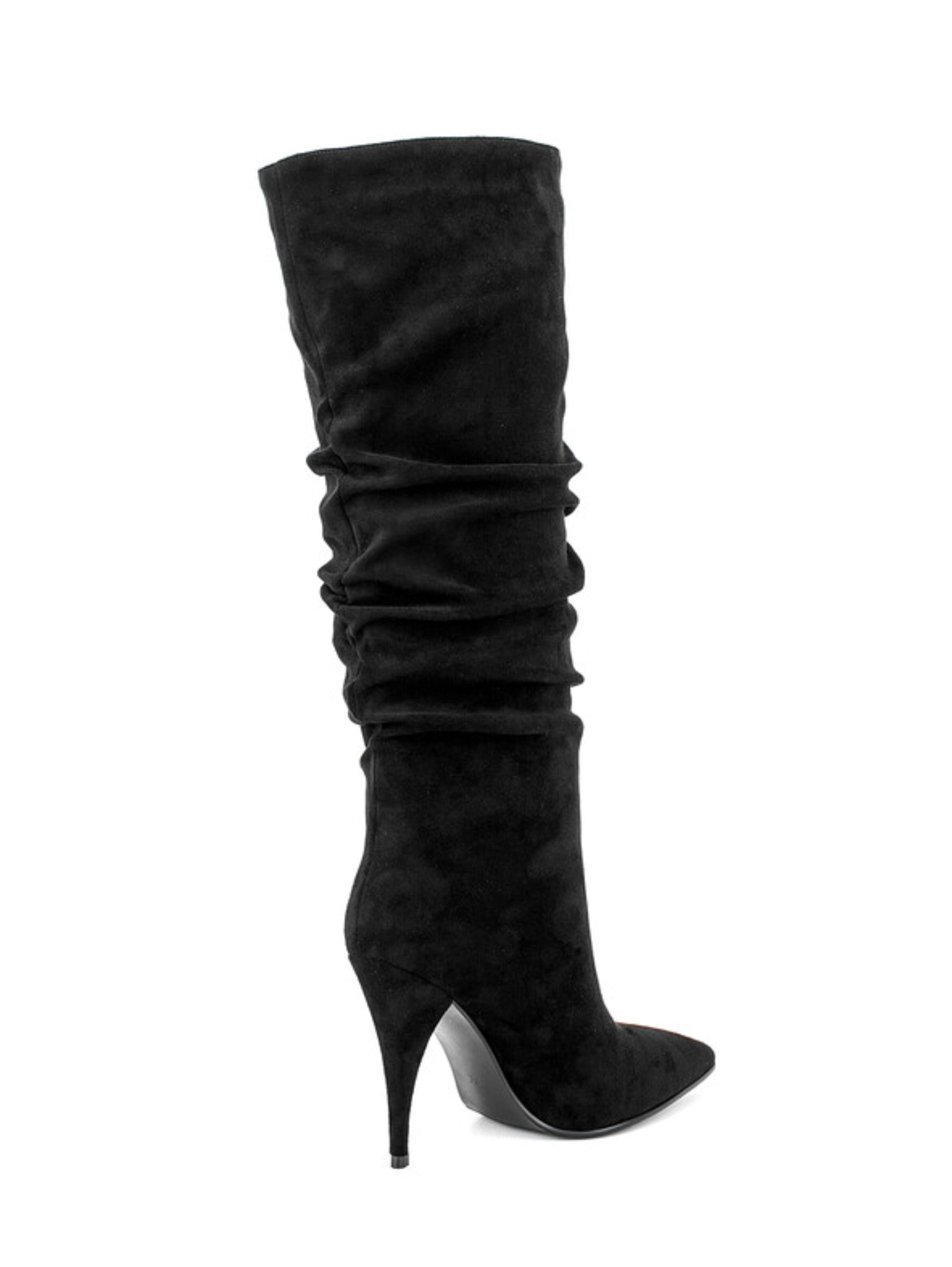 Designed for the discerning wearer, these Black Vegan Suede Pointed Toe Tall Boots combine refined craftsmanship with a commanding stiletto heel. The high heel enhances posture and elongates the silhouette, while the pointed toe delivers a sleek, modern edge. Ideal for elevating both professional and evening ensembles with expert sophistication.