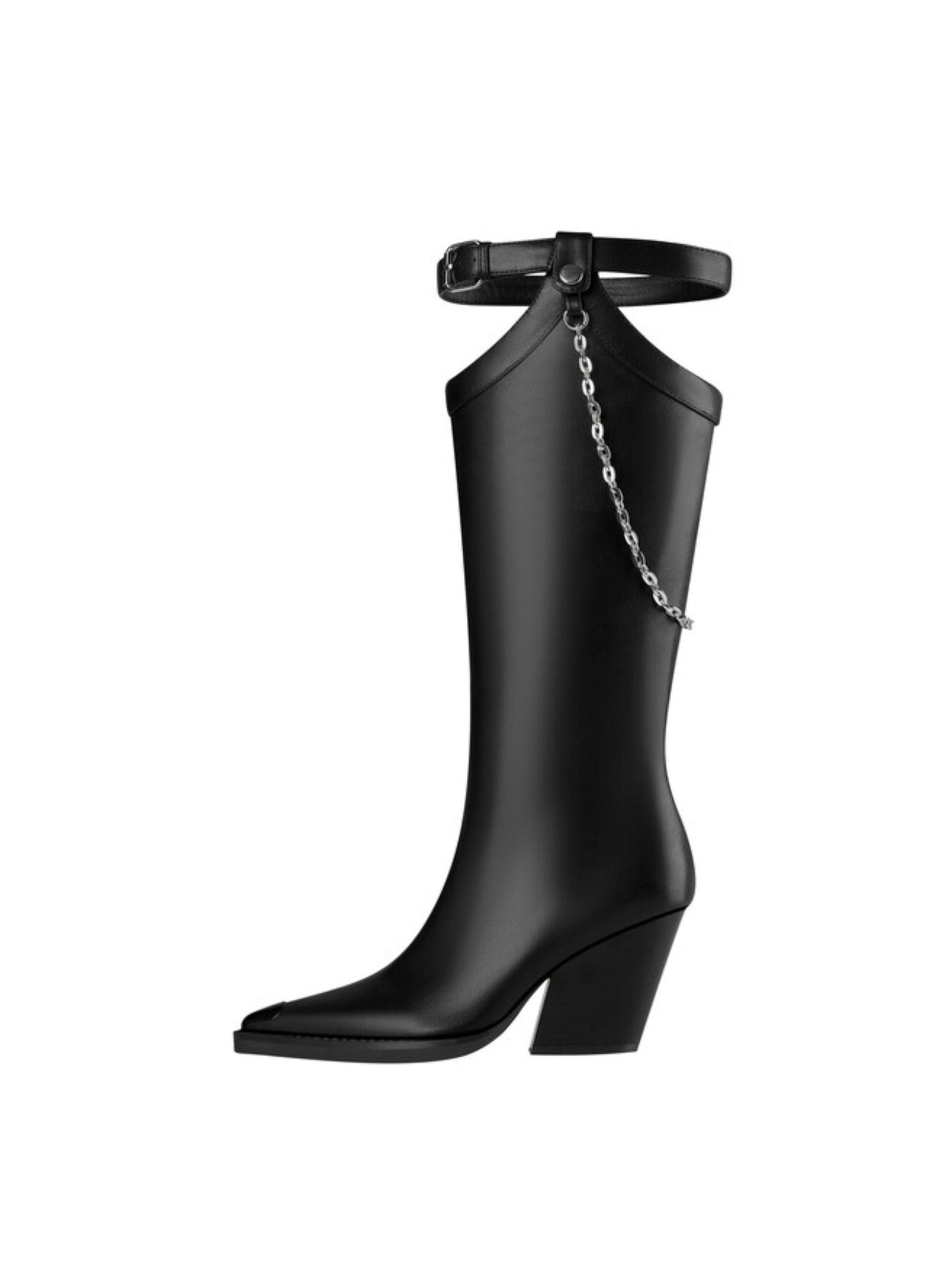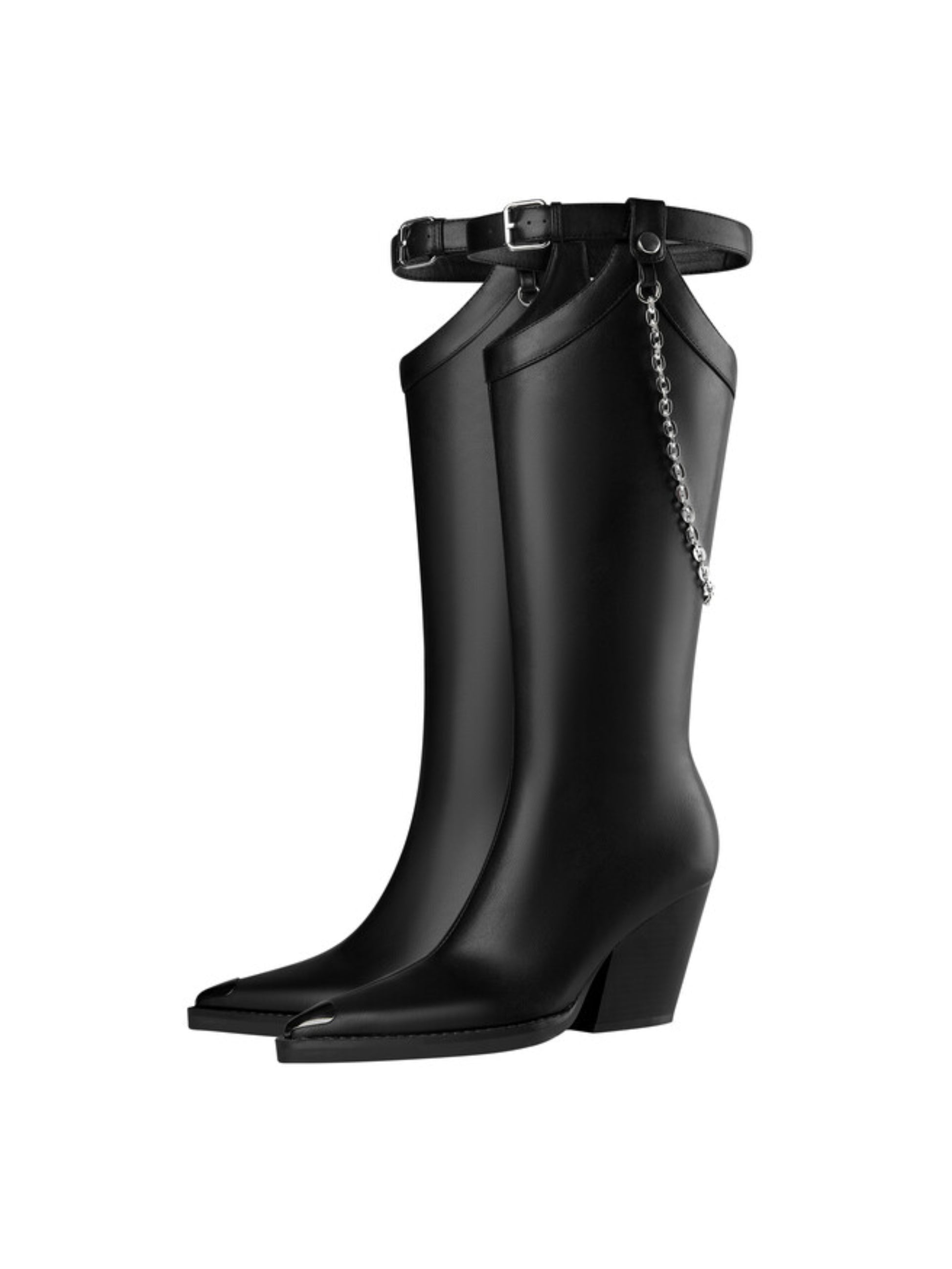 These black pointed-toe thigh-high boots exemplify contemporary edge with refined construction. Crafted from quality faux leather, they deliver a polished finish with practical slip-on convenience enhanced by a top buckle for secure fit and adjustable styling. The wedge heel provides substantial height while maintaining stability and all-day wearability—a sophisticated alternative to traditional stilettos. A delicate chain accent adorns the top, adding an unexpected detail that elevates the design from classic to distinctly modern. An investment piece that seamlessly transitions from day to evening wear.