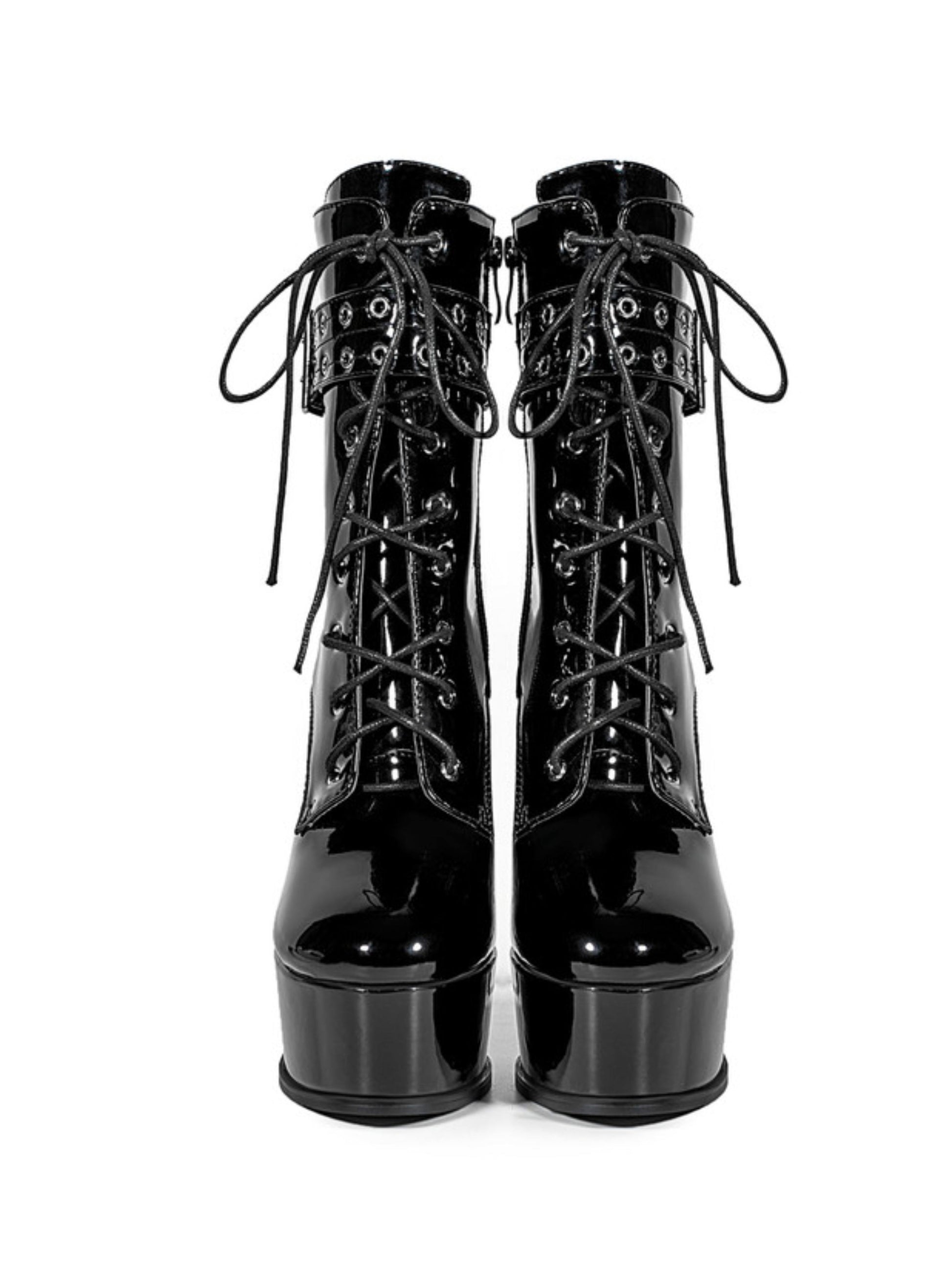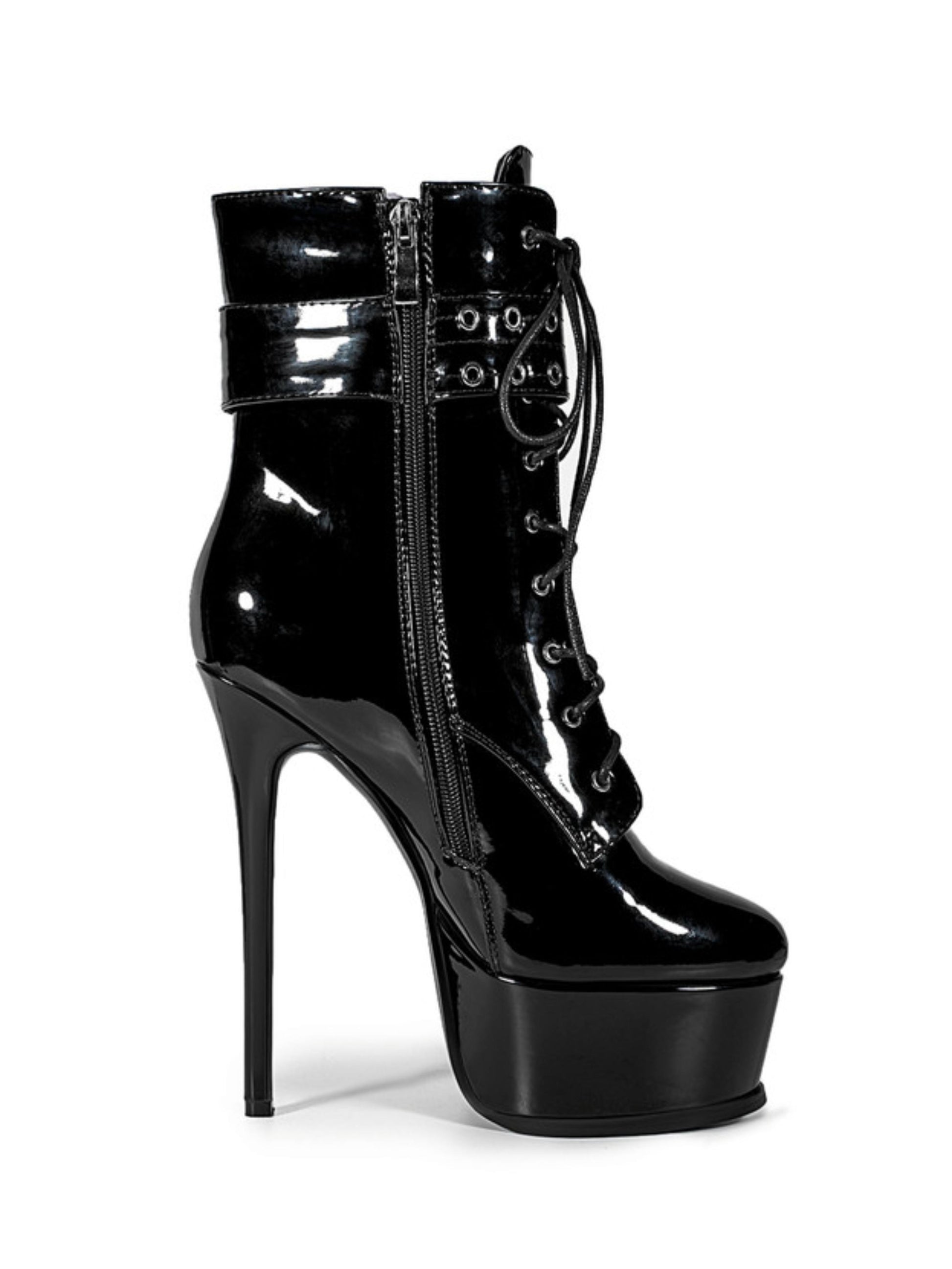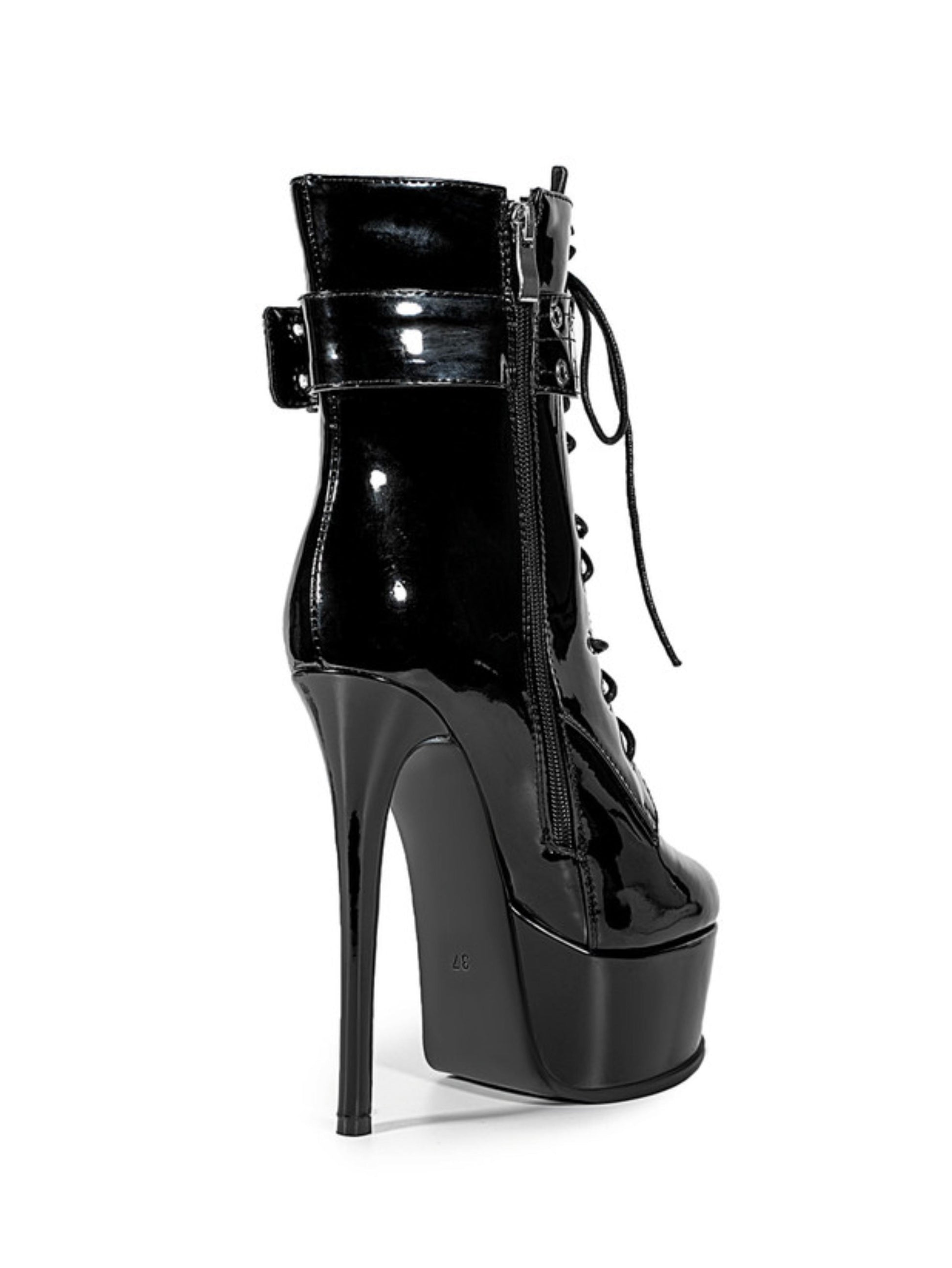 Elevate your style with these Black Round Toe Heeled Ankle Boots. Crafted from patent leather, they feature an ultra-high stiletto heel and supportive platform for a confident lift. The lace-up front, side zipper, and buckle detail combine practicality with edgy flair, ensuring a secure fit and easy wear. Perfect for turning heads, these boots add a fierce, fashionable edge to any outfit.
