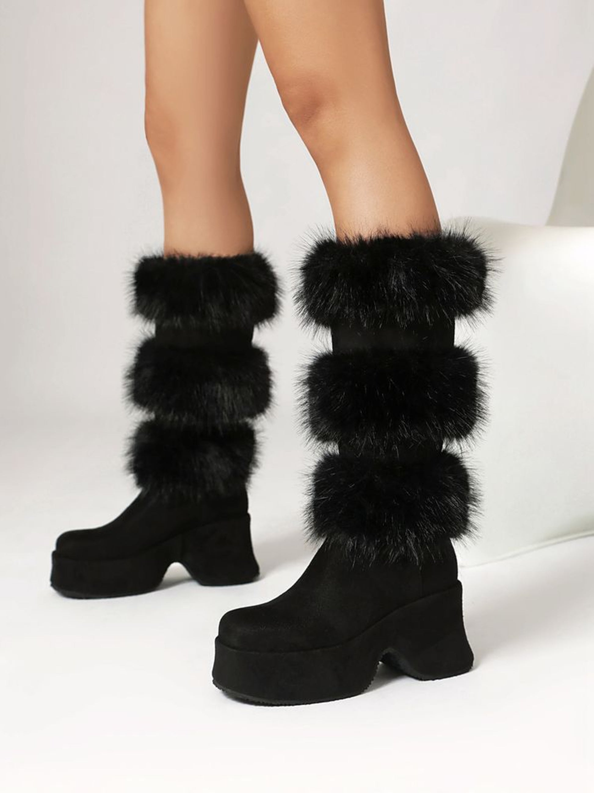 Transform your everyday look with these chic black mid-calf boots that deliver style without compromise. Crafted from soft faux suede and topped with plush faux fur, they offer a luxurious feel that elevates casual and dressy occasions alike. The slip-on convenience means you'll reach for them constantly, while the square toe and platform heel provide a modern edge and comfortable support. These boots are the versatile essential that bridges the gap between comfort and sophistication—the pair you'll wonder how you ever lived without.