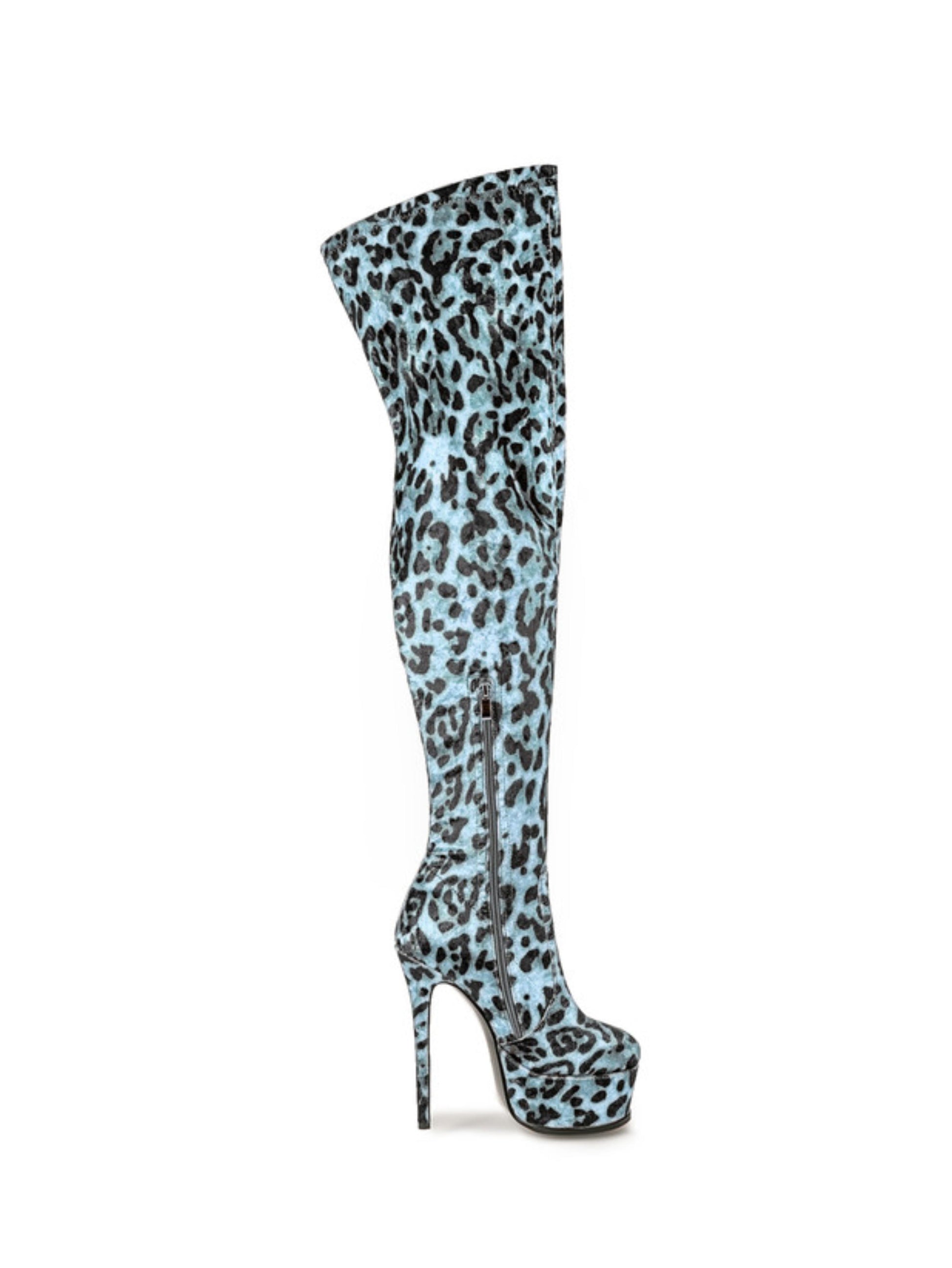 These Blue Round Toe Women's Thigh-High Boots expertly blend striking style with functional design. Made from premium faux leather with a vibrant blue animal print, they feature an ultra-high stiletto heel and platform for enhanced height and balance. The round toe ensures comfort without compromising elegance, making these boots a sophisticated choice for bold, fashion-forward wearers.
