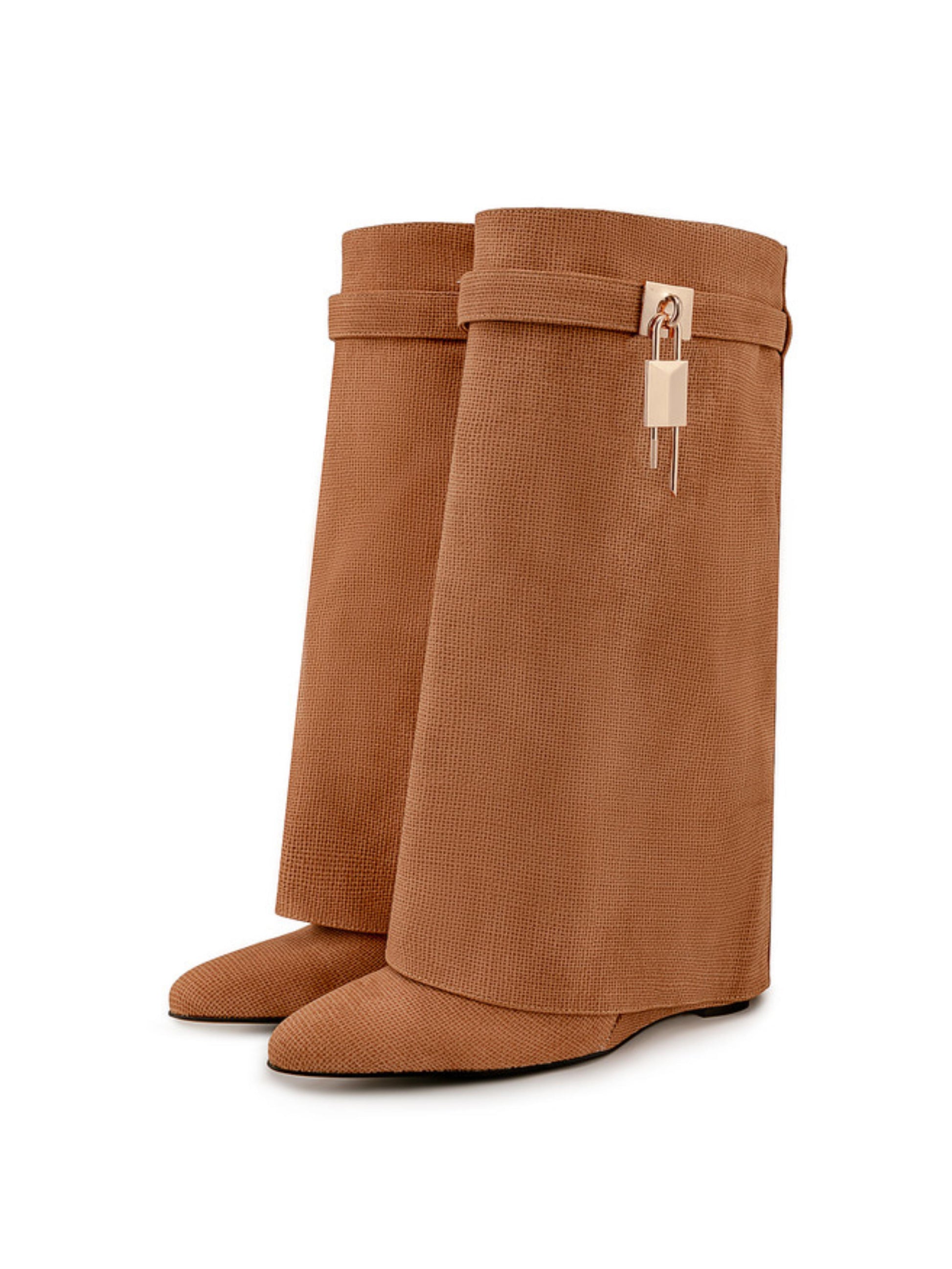 These brown mid-calf wedge boots offer a perfect fusion of sophistication and modern design. Crafted with a rich textured fabric, they feature a unique draped overlay that creates a sleek, sculpted look. The concealed wedge heel adds subtle height while maintaining comfort, and the metallic buckle detail lends a touch of polished refinement—ideal for both daywear and evening outfits.