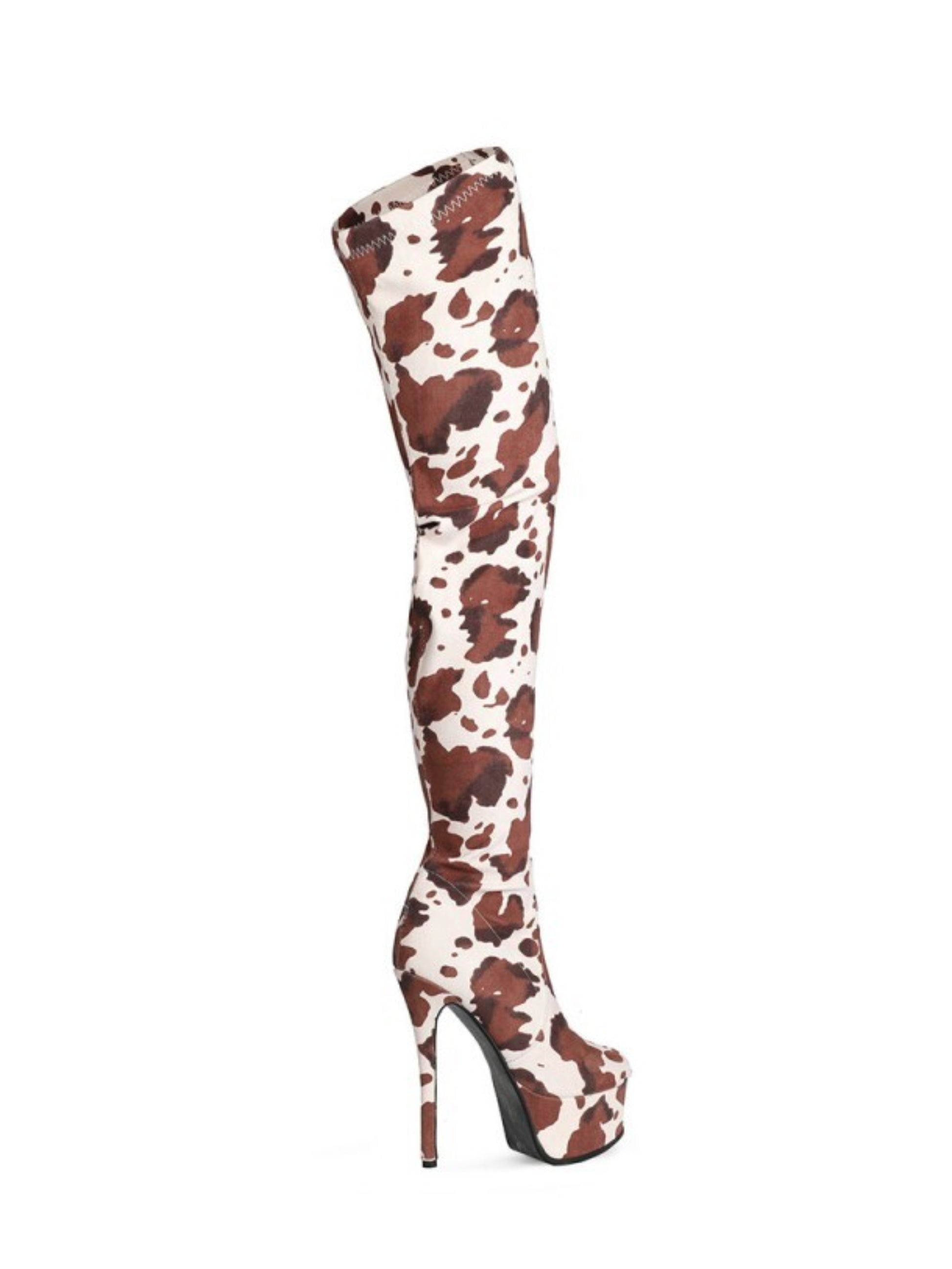 Step confidently in these Brown and White Cow Print Thigh-High Boots designed with a round toe and ultra high stiletto heel for a perfect balance of style and comfort. The platform sole helps reduce pressure on your feet, while the slip-on design makes them easy to wear. These boots combine bold fashion with practical features to support you all day or night.