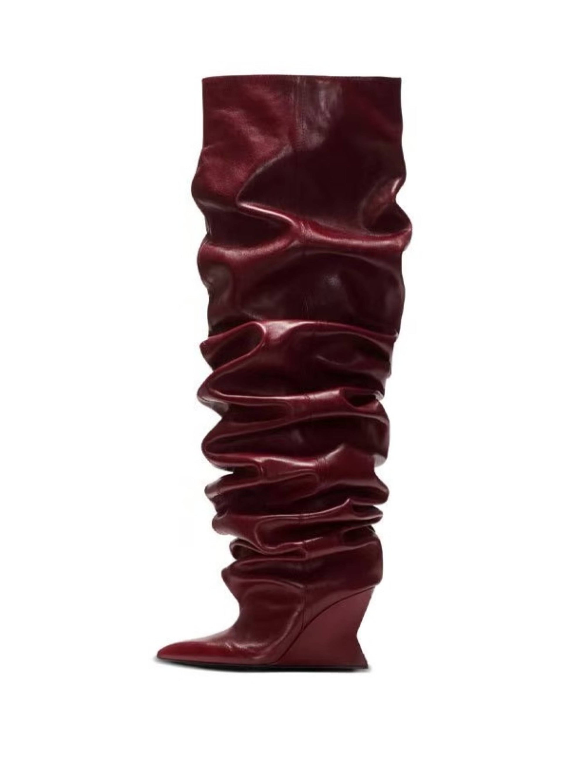 Make a bold fashion statement with these Burgundy Slouchy Knee-High Boots. Crafted from soft faux leather, they feature a dramatically ruched shaft and a sleek pointed toe that exude modern sophistication. The hidden wedge heel provides height and comfort, making these boots perfect for elevating both day and evening looks with an effortlessly chic edge.