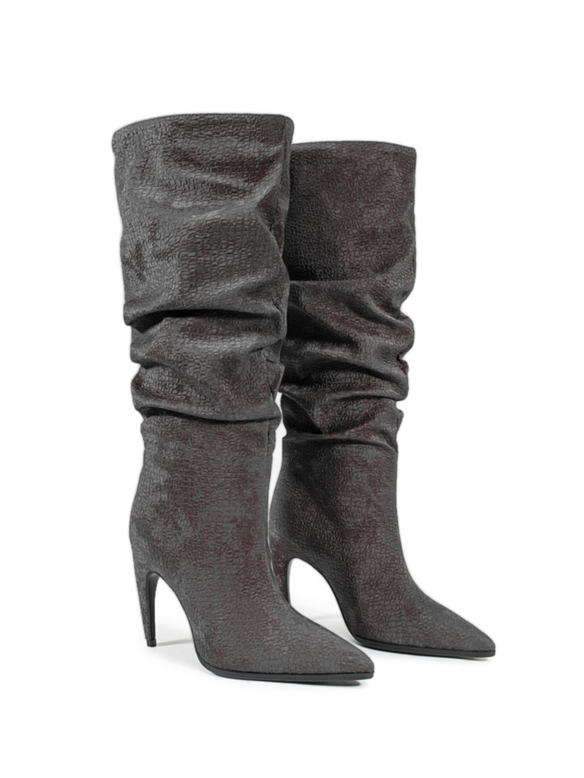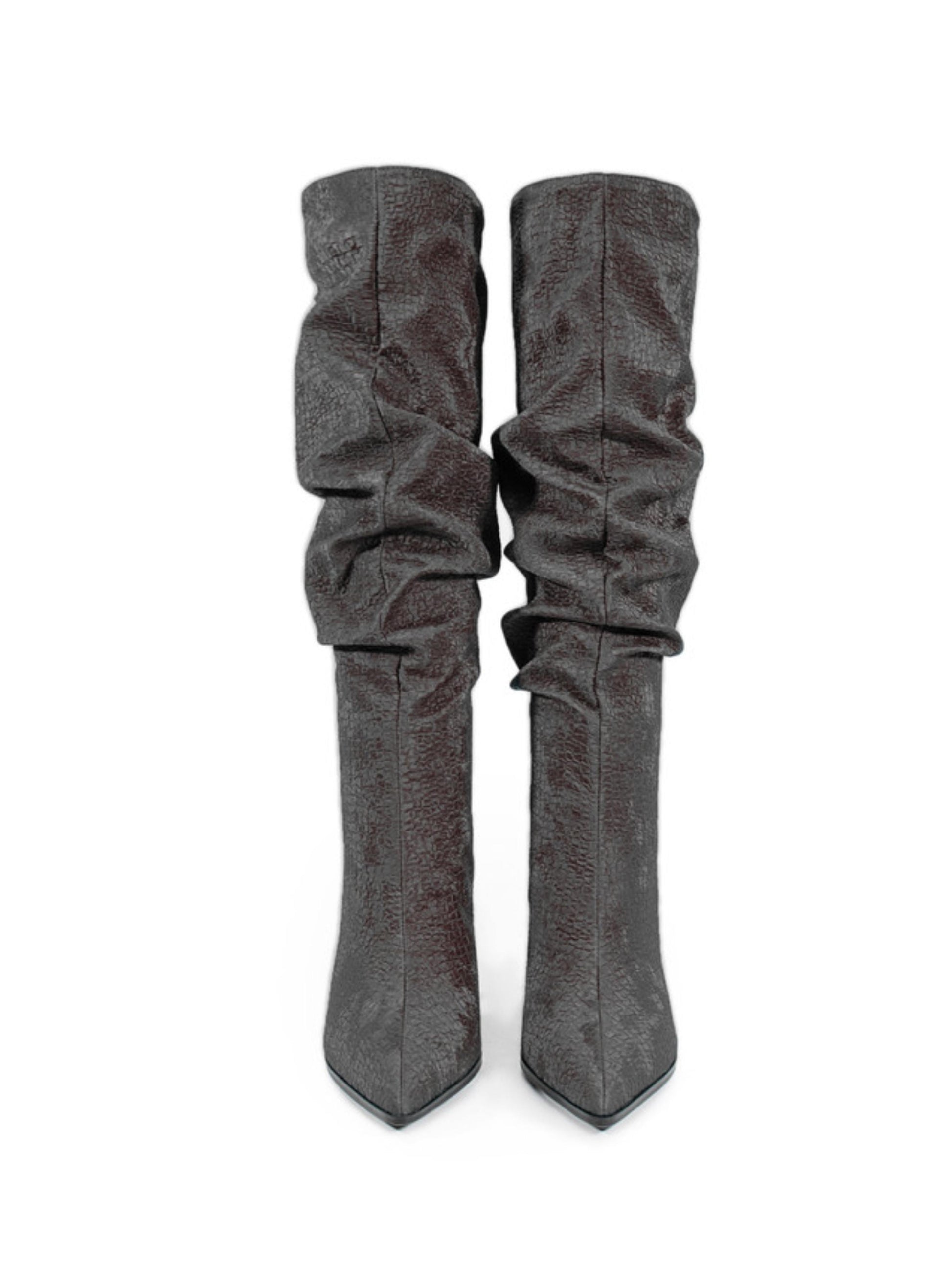 This sophisticated charcoal gray boot blends classic style with modern edge. Featuring a relaxed slouchy shaft that adds texture and dimension, it’s crafted from a subtly textured material for a refined matte finish. The pointed toe elongates the leg, while the sleek high stiletto heel offers a touch of elegance and confidence. Perfect for both casual chic and evening wear, this boot delivers effortless versatility and timeless appeal.