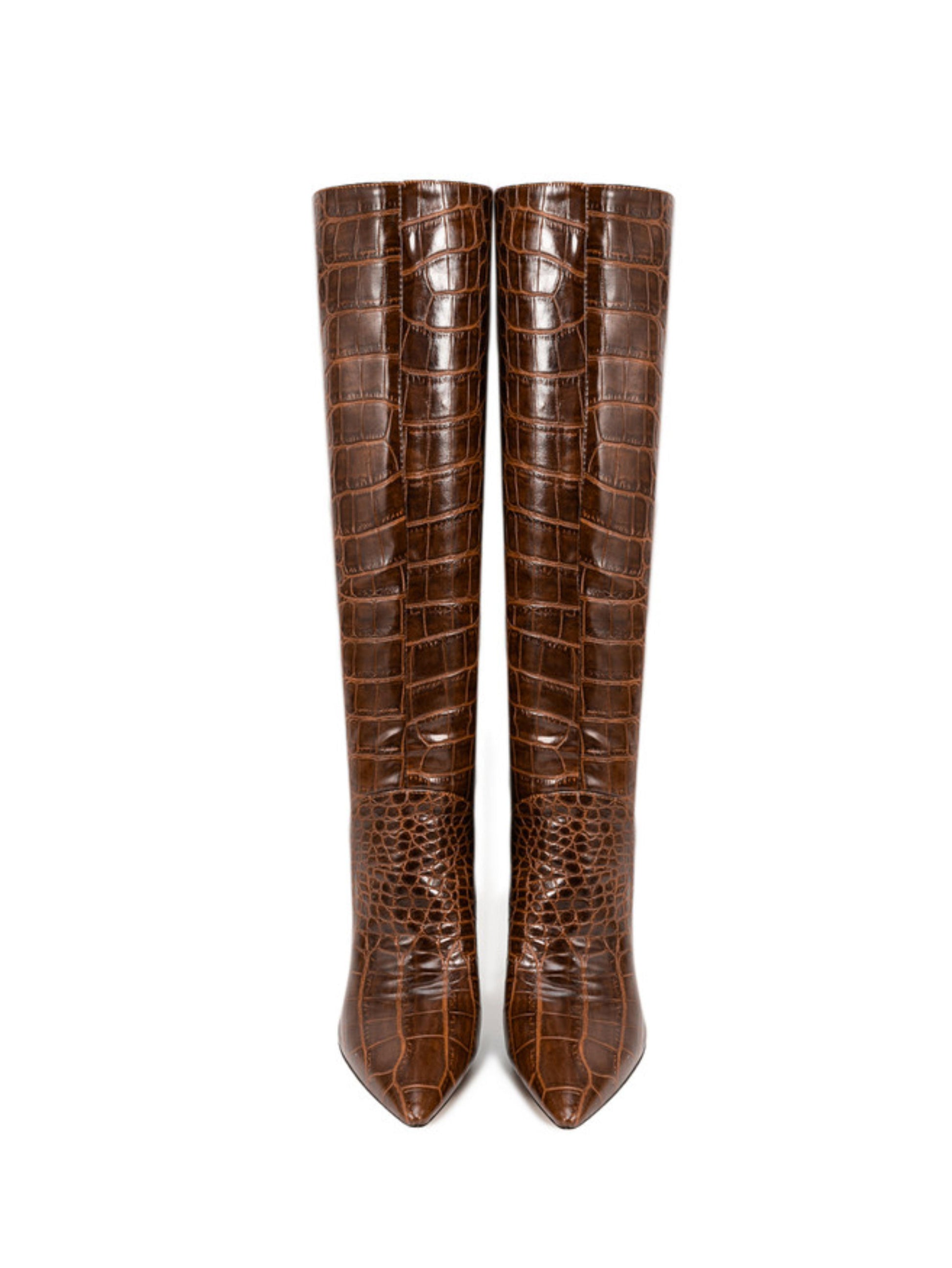 Chocolate Brown Croc-Embossed Knee-High Stiletto Boots