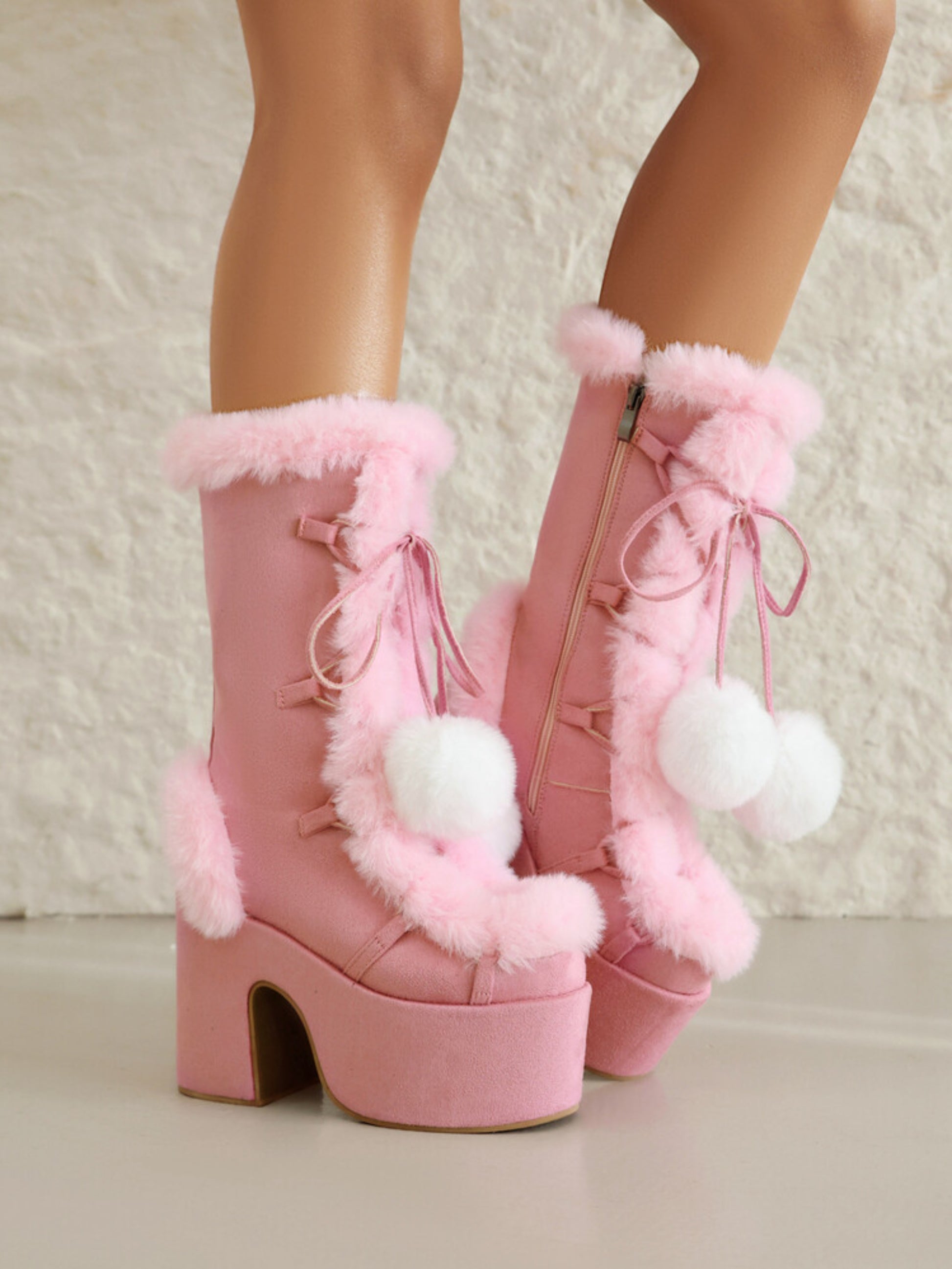 Cute Pink Pom Pom Platform Chunky High Heeled Boots