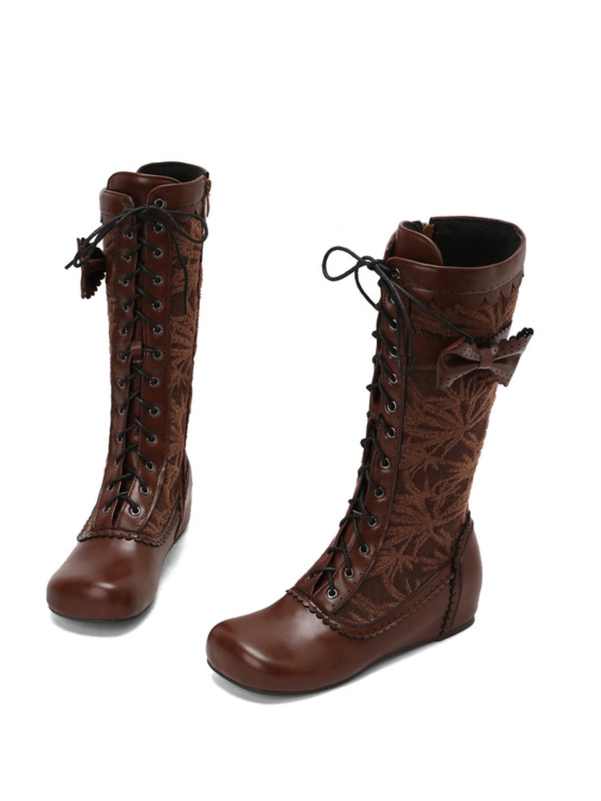 This knee-high boot blends vintage charm with modern detailing. Crafted in a rich brown finish, it features a smooth, rounded toe and a low, comfortable wedge heel. A decorative bow sits on the outer side for a feminine touch, while a full-length lace-up front with metal eyelets provides an adjustable, fitted look. This boot pairs well with dresses, skirts, or skinny jeans for a romantic, slightly retro outfit.
