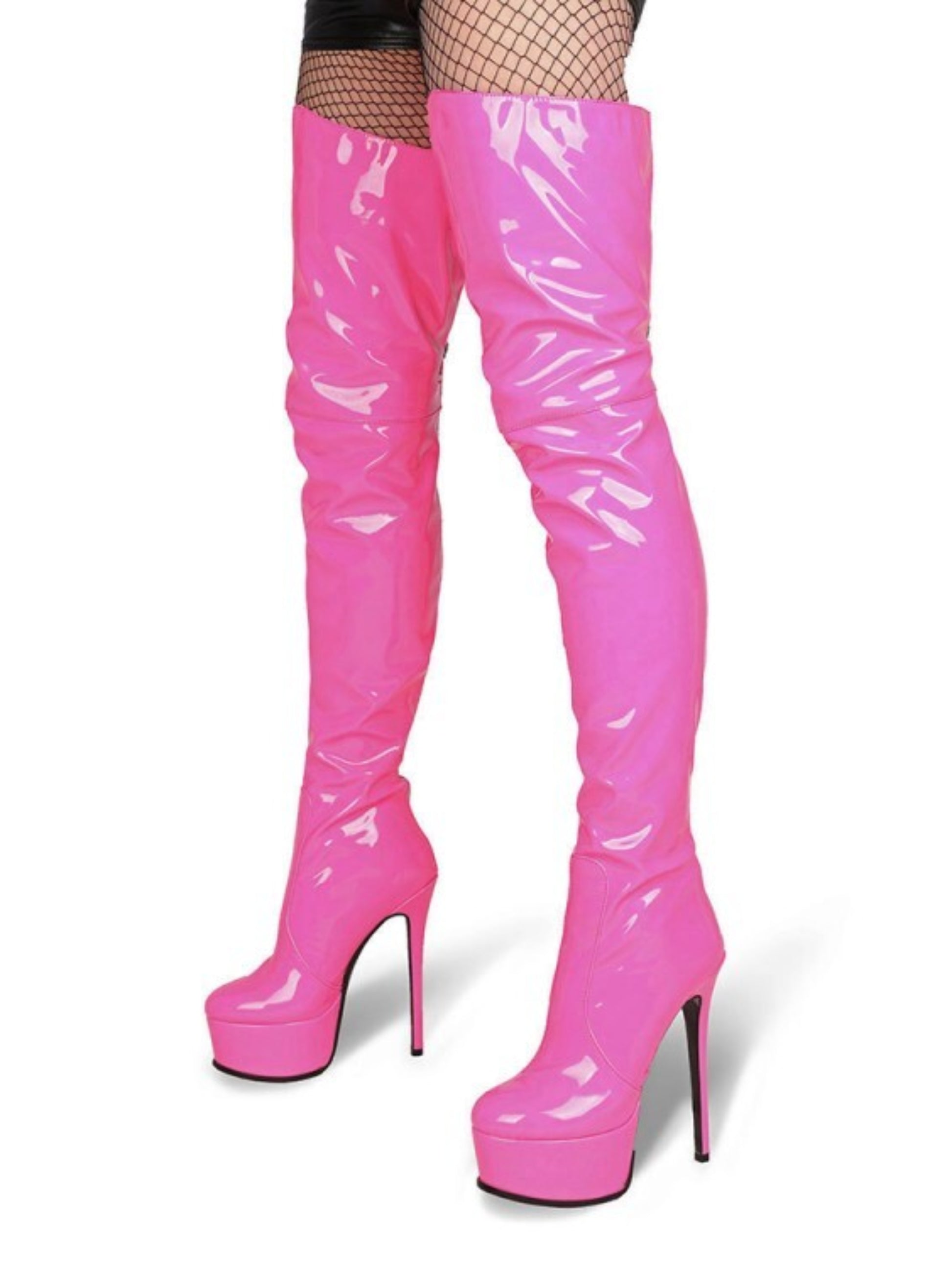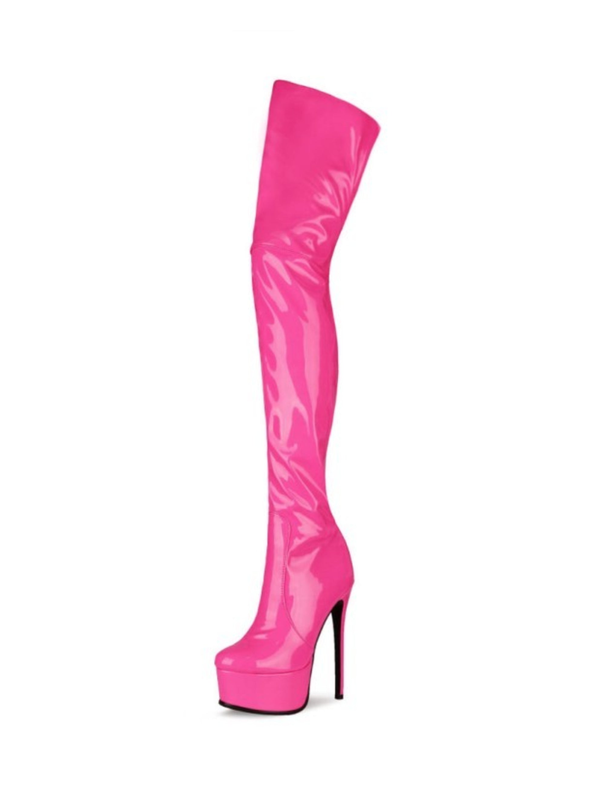 These fuchsia thigh-high boots combine glossy patent leather with a slouchy silhouette for a stylish look. Featuring a round toe, ultra high stiletto heel, and platform, they offer height and stability. The back zipper ensures a secure fit, making these boots both striking and comfortable for confident all-day wear.