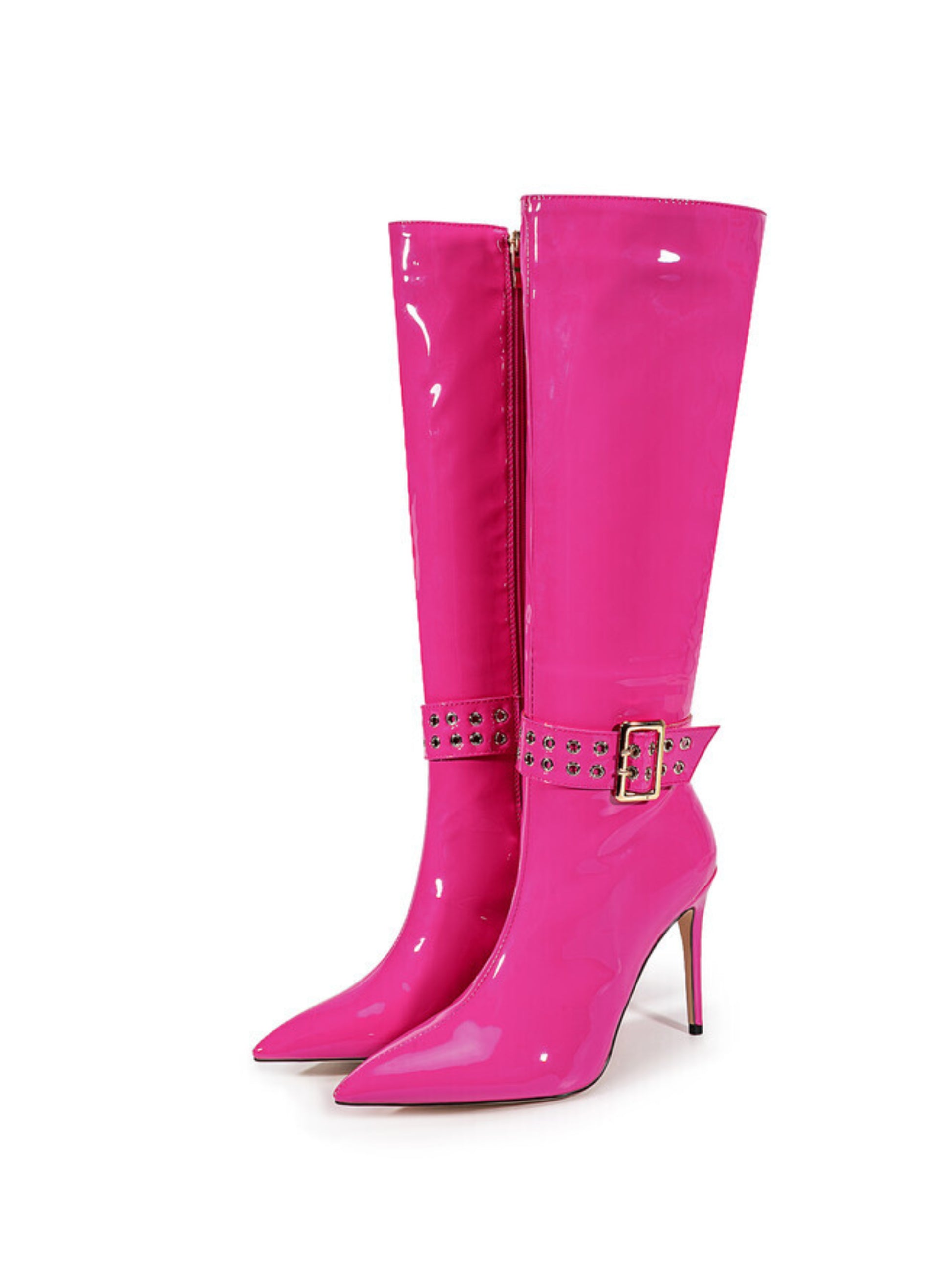 Add a pop of vibrant fun with these Fuchsia Stiletto High-Heel Tall Boots. Crafted from glossy patent leather, they feature a sharp pointed toe and a sky-high stiletto heel that turns every step into a statement. The side zipper and playful buckle detail below add flair and easy wearability, making these boots the perfect bold choice to brighten up any outfit.