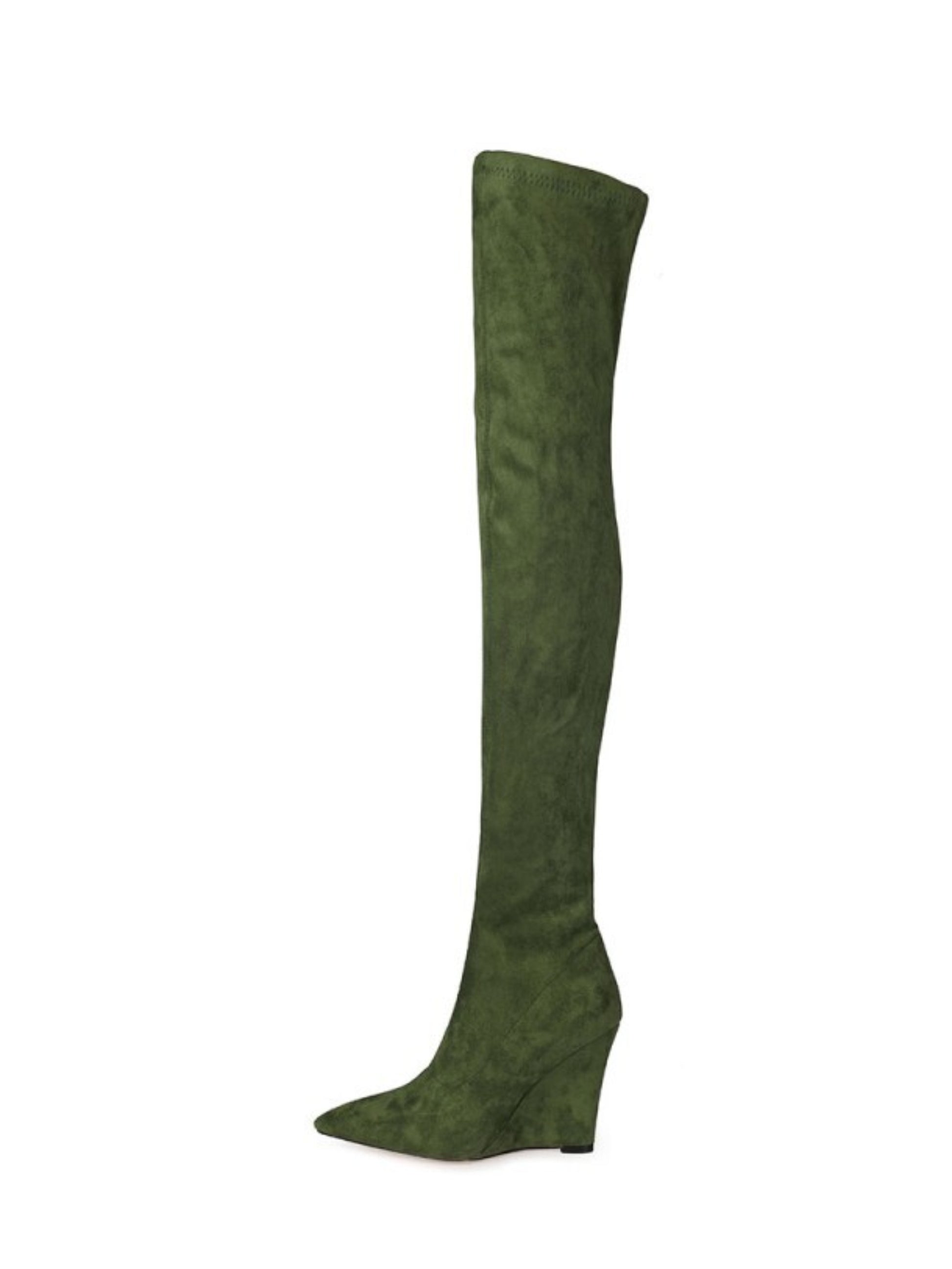 Step boldly into fashion with these Green Over-The-Knee Boots, crafted from luscious faux suede. Featuring a sleek pointed toe and a towering wedge heel, they offer a daring blend of height and stability. The slip-on design ensures effortless wear while making a striking statement that elevates any outfit with fearless style.