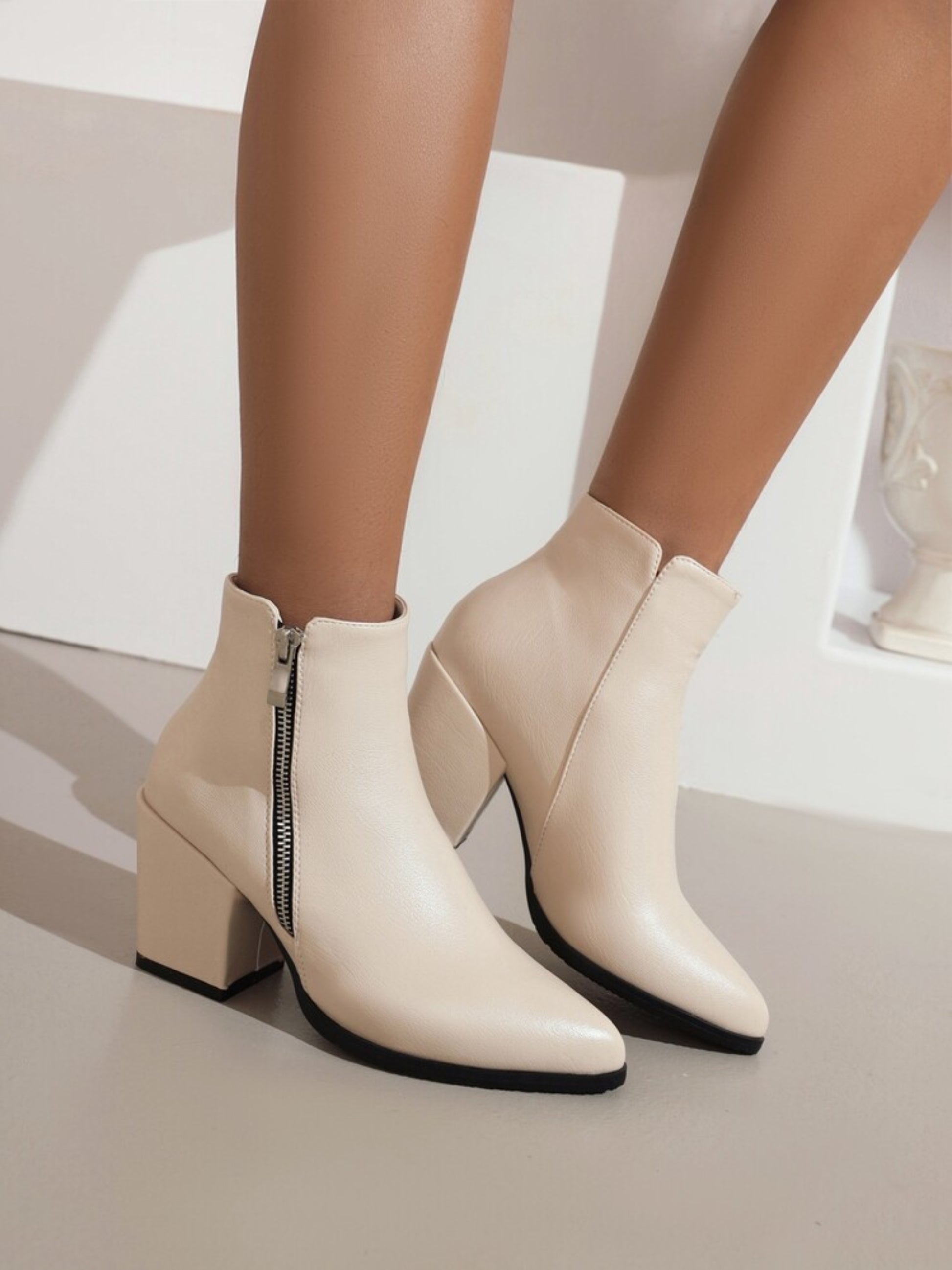 Ivory Pointed Toe Block Heel Ankle Boots with Zipper