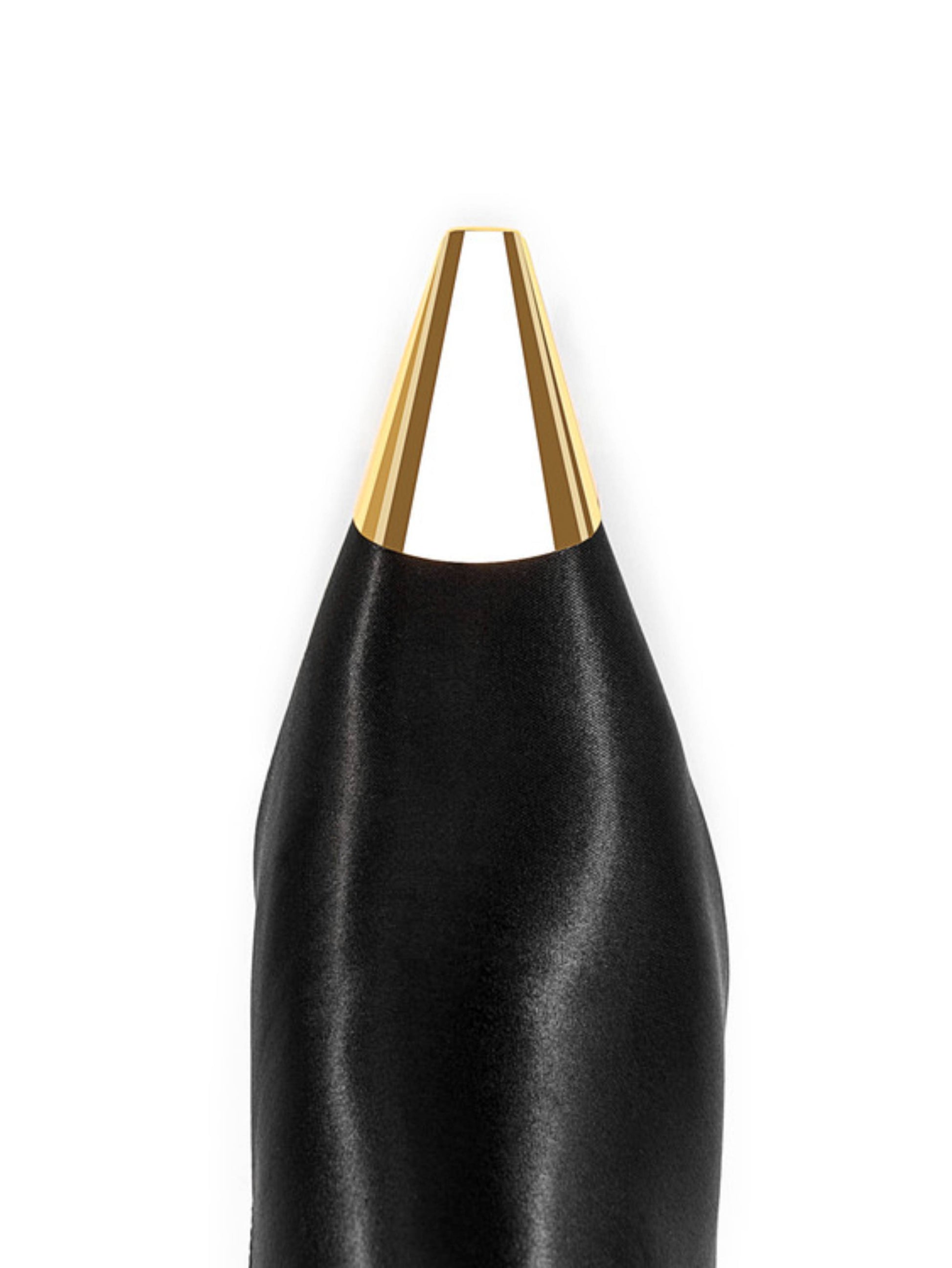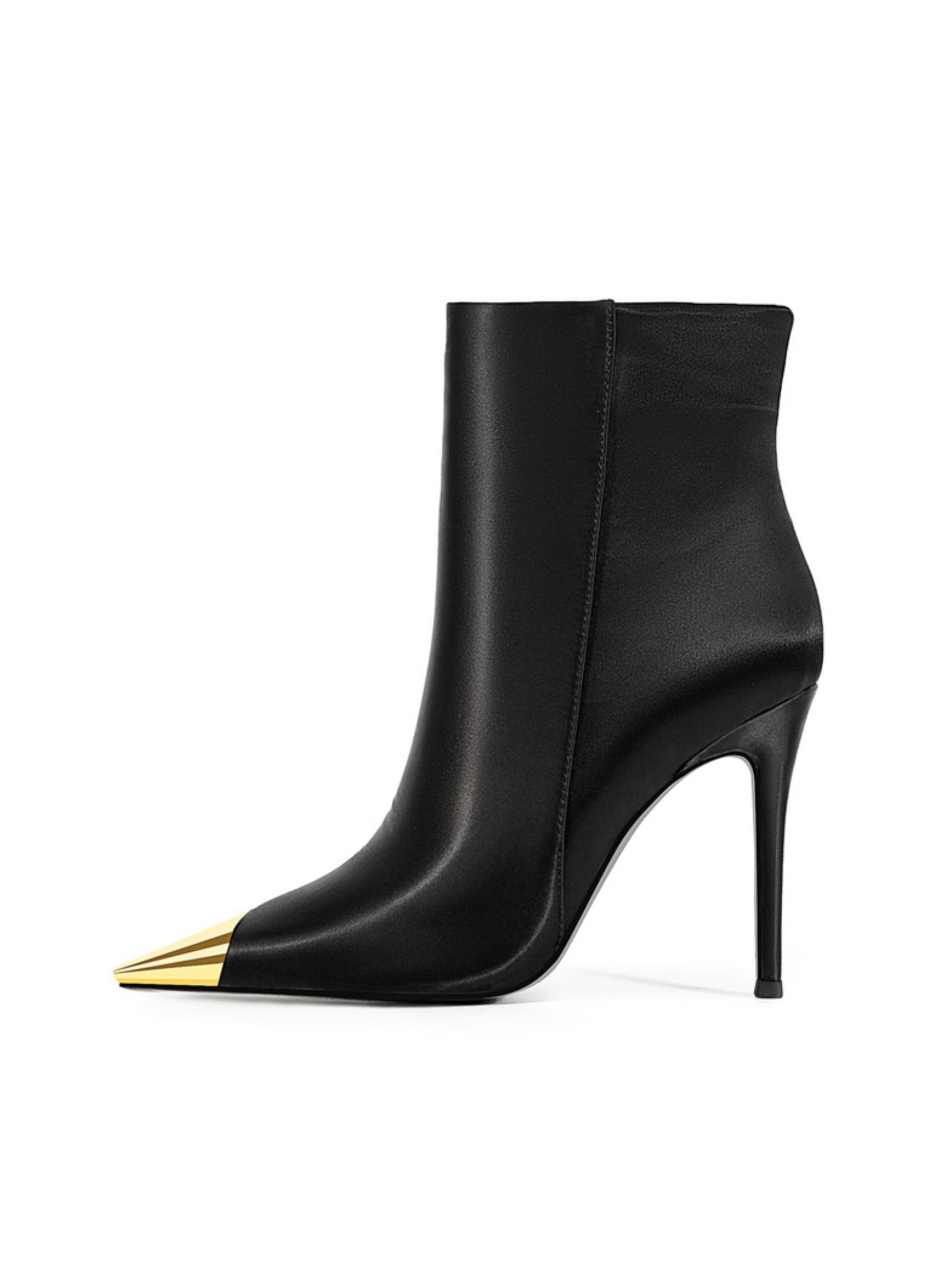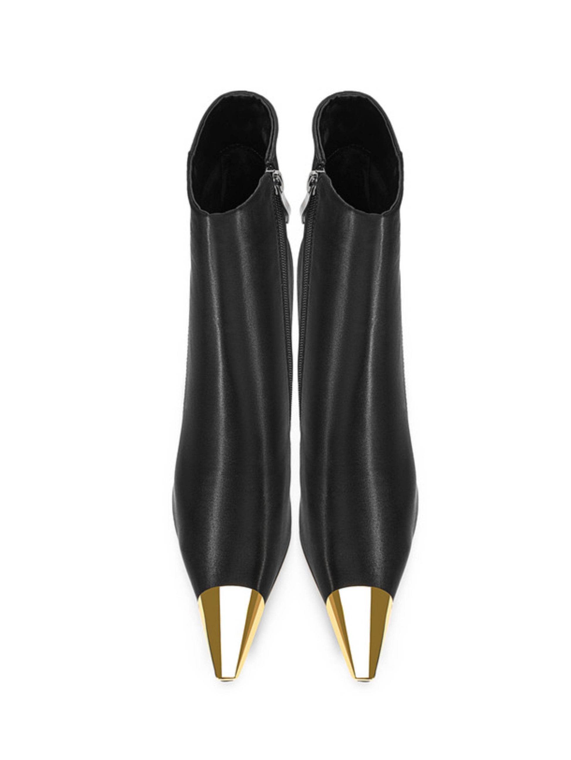 Step into sleek sophistication with the Midnight Edge Ankle Boot. This striking black stiletto boot features a smooth satin-like finish that exudes modern luxury. Its standout detail — a polished gold metal toe cap — adds a bold, high-fashion accent, perfect for making a statement day or night. With a razor-sharp silhouette and sky-high heel, this boot elevates any outfit with effortless elegance and confidence.