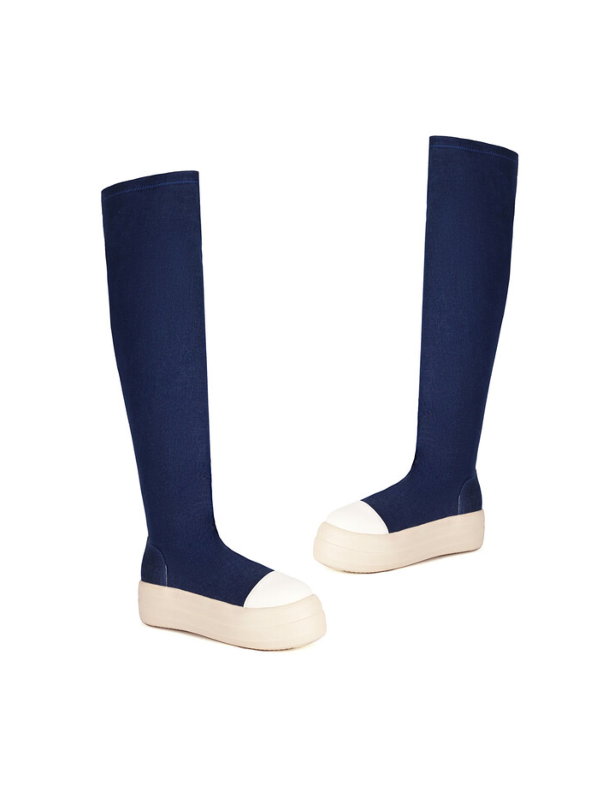 Make a bold statement with these fun navy blue thigh-high boots that blend comfort with undeniable style. The soft faux suede hugs your leg beautifully, while the charming cream-colored toe and platform add a playful pop of contrast that catches every eye. The generous chunky platform heel delivers both height and stability, so you can strut with confidence all day long. The slip-on design means zero fuss—just pull them on and go. Perfect for those ready to have fun with fashion and turn heads wherever you roam.