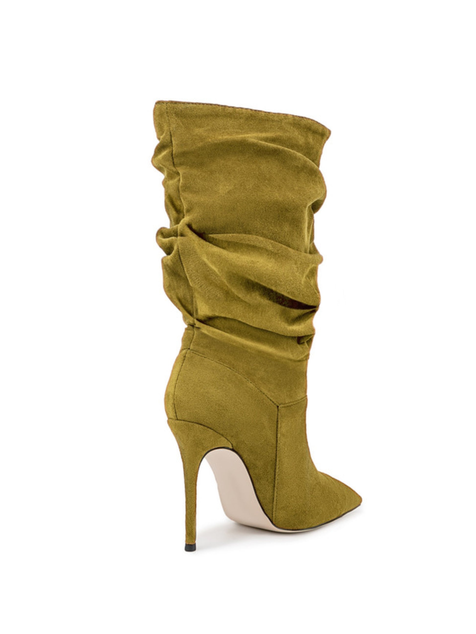 Make a daring statement with these Olive Green Mid-Calf Boots in soft suede. Their slouchy silhouette and pointed toe pair perfectly with an ultra-high stiletto heel for bold height and edgy style. The slip-on design ensures easy wear while commanding attention with every step you take.