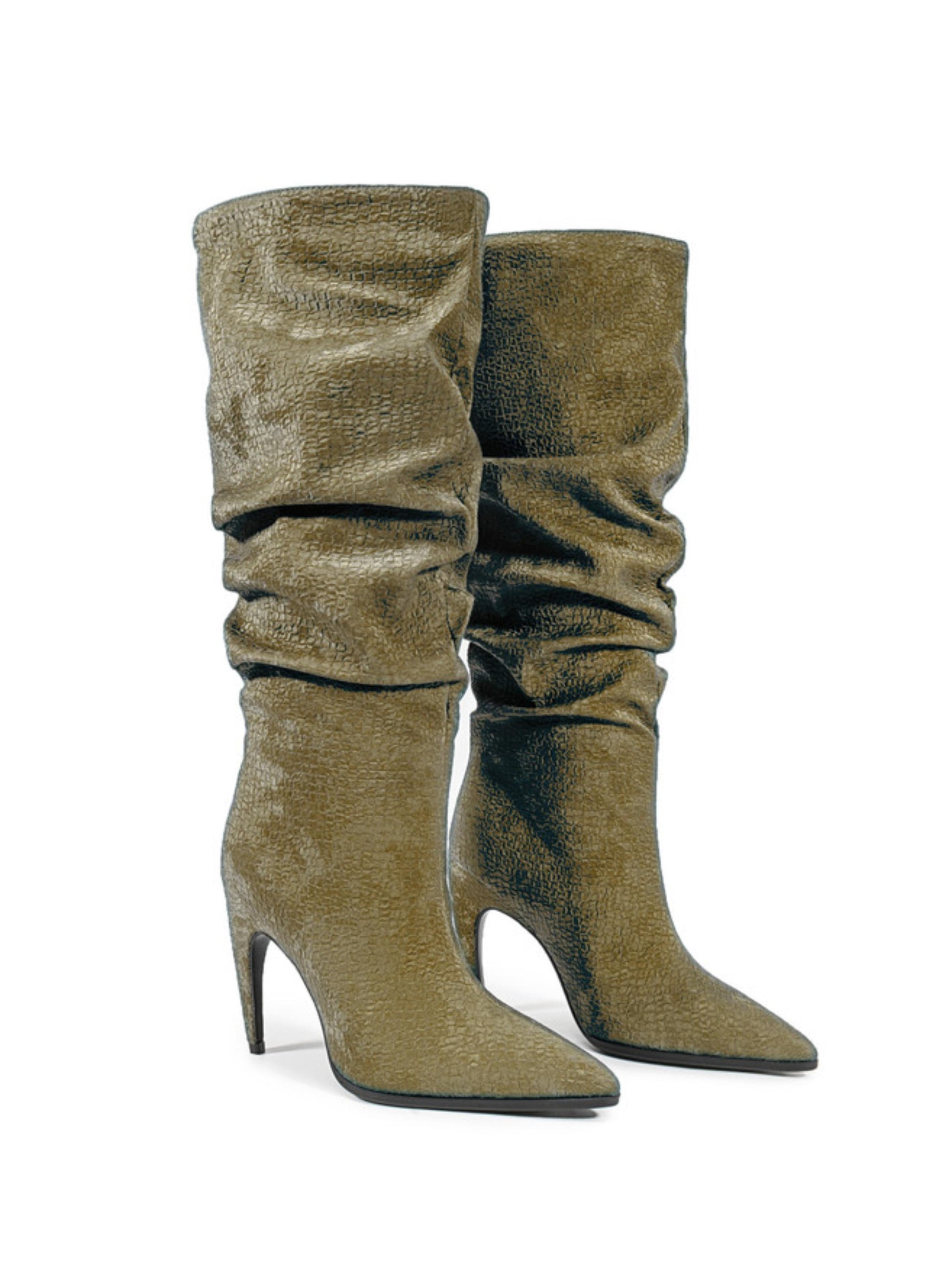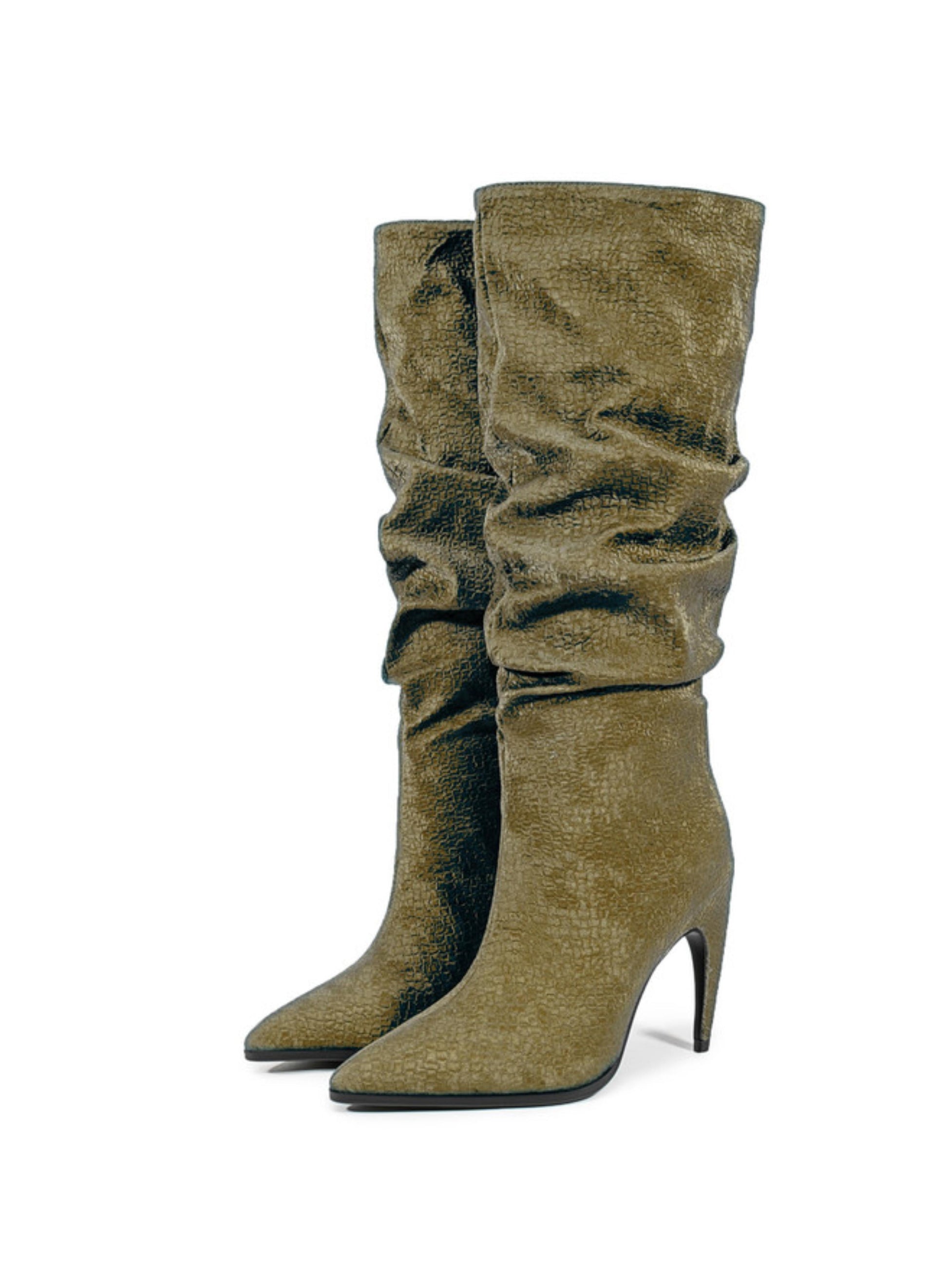 Embrace earthy sophistication with this olive green slouchy high-heel boot. The soft, textured finish and relaxed shaft design bring effortless style and comfort, while the pointed toe and sleek stiletto heel add a touch of refined glamour. Versatile and chic, the muted olive tone pairs beautifully with neutrals, browns, and creams — perfect for elevating both casual and dressy looks.