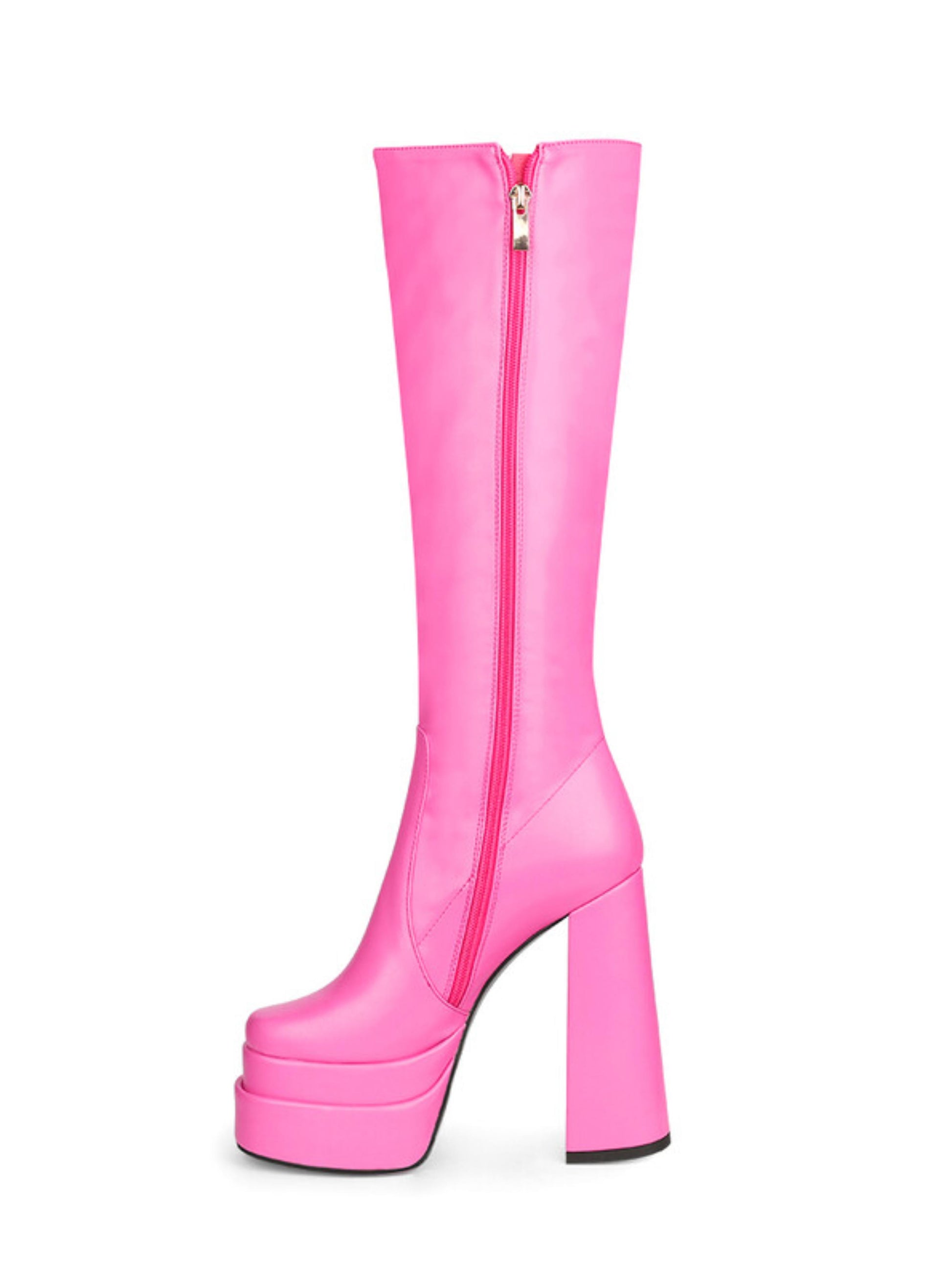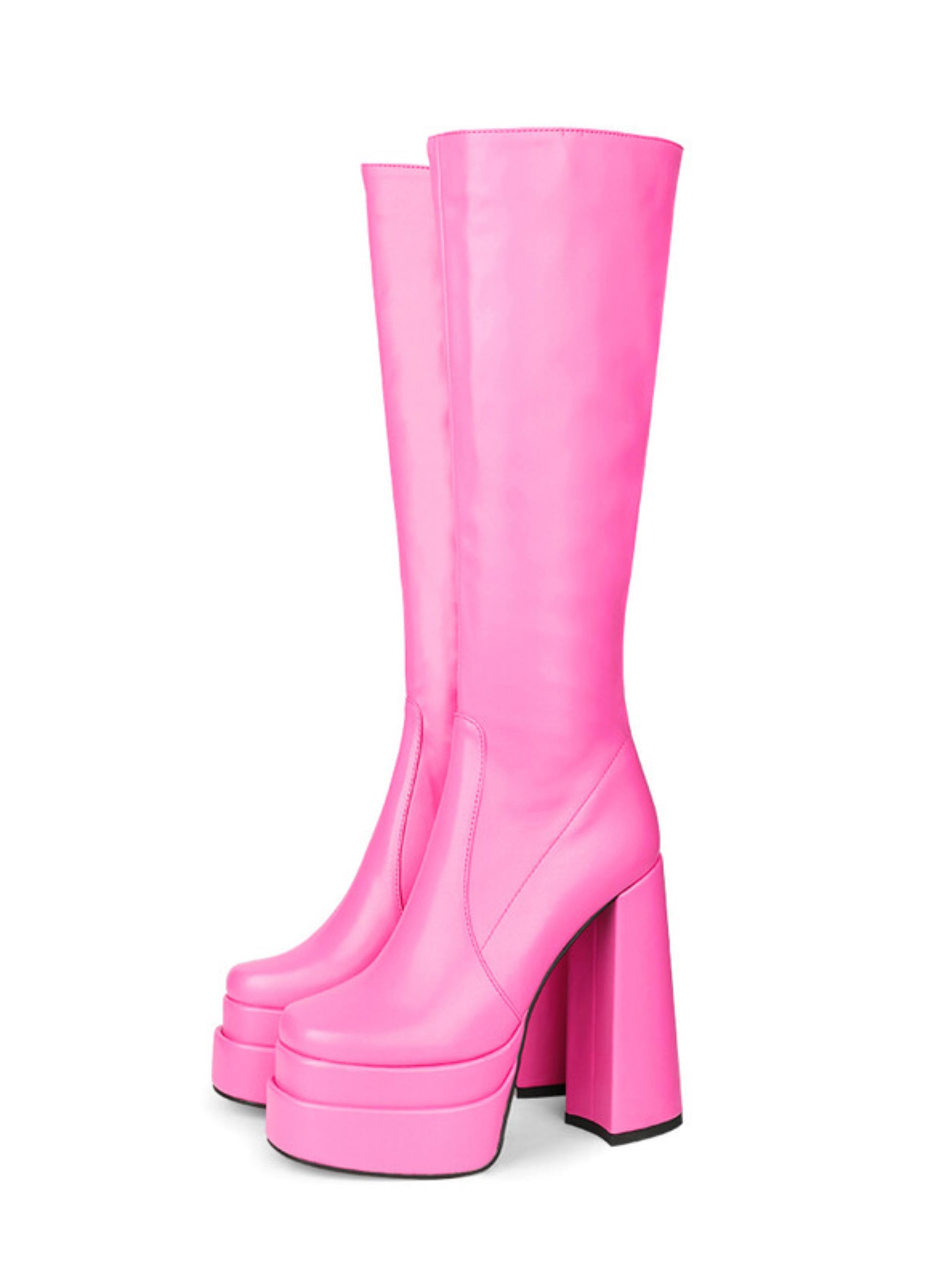 These Pink Chunky Platform Knee-High Boots expertly blend bold design with practical features. With an ultra-high heel and a sturdy chunky platform, they provide impressive height and stability. The side zipper ensures easy wear while maintaining a sleek silhouette. Perfect for those seeking a confident, fashion-forward statement in every step.