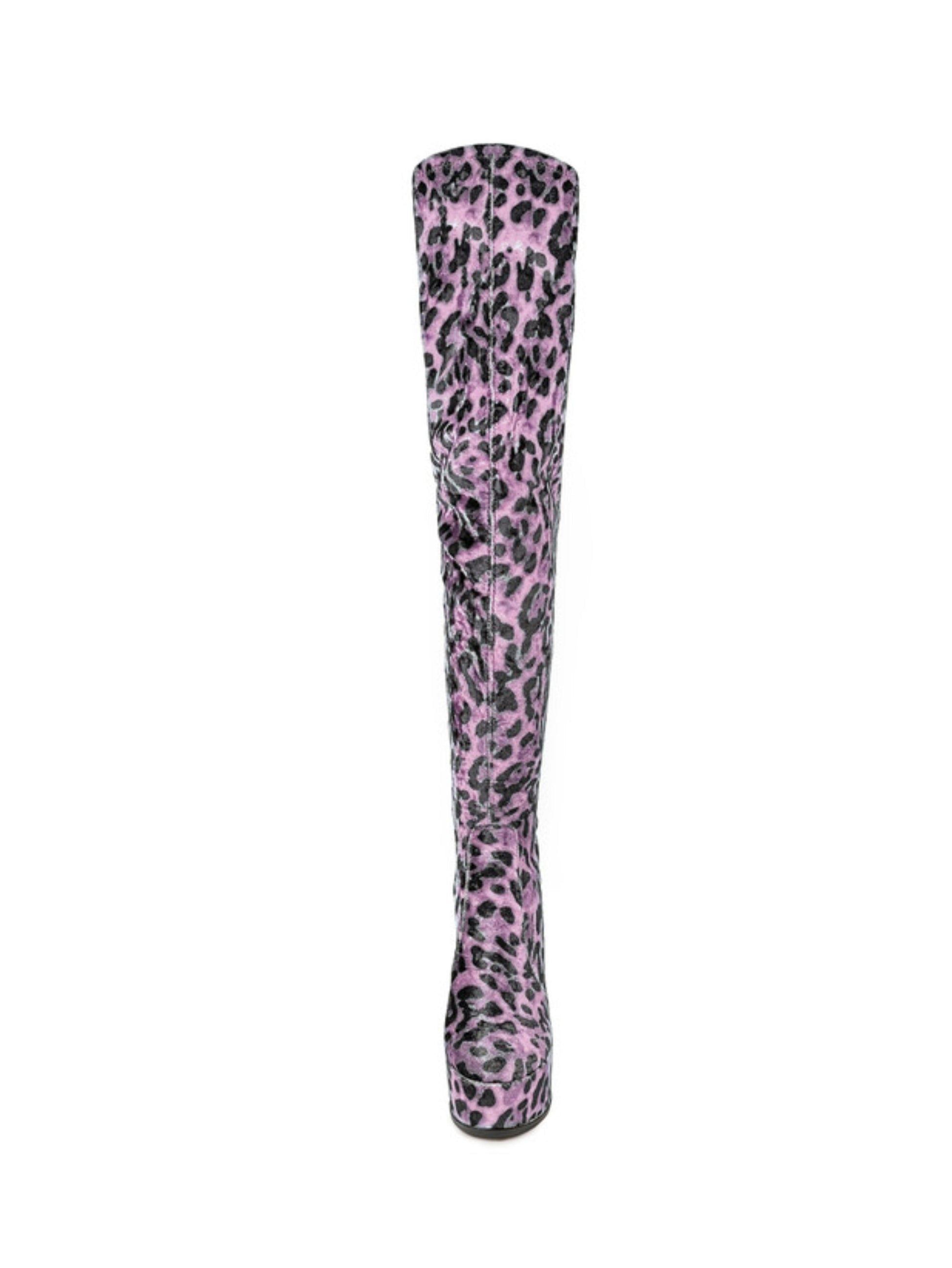 Step out in style with these playful Purple Faux Leather Heeled Over-The-Knee Boots. Featuring a vibrant purple animal print, ultra-high heel, and supportive platform, they add height and fun to any outfit. The round toe keeps things comfy, while the side zipper makes slipping in and out a breeze. Perfect for turning heads with a pop of bold color and personality.