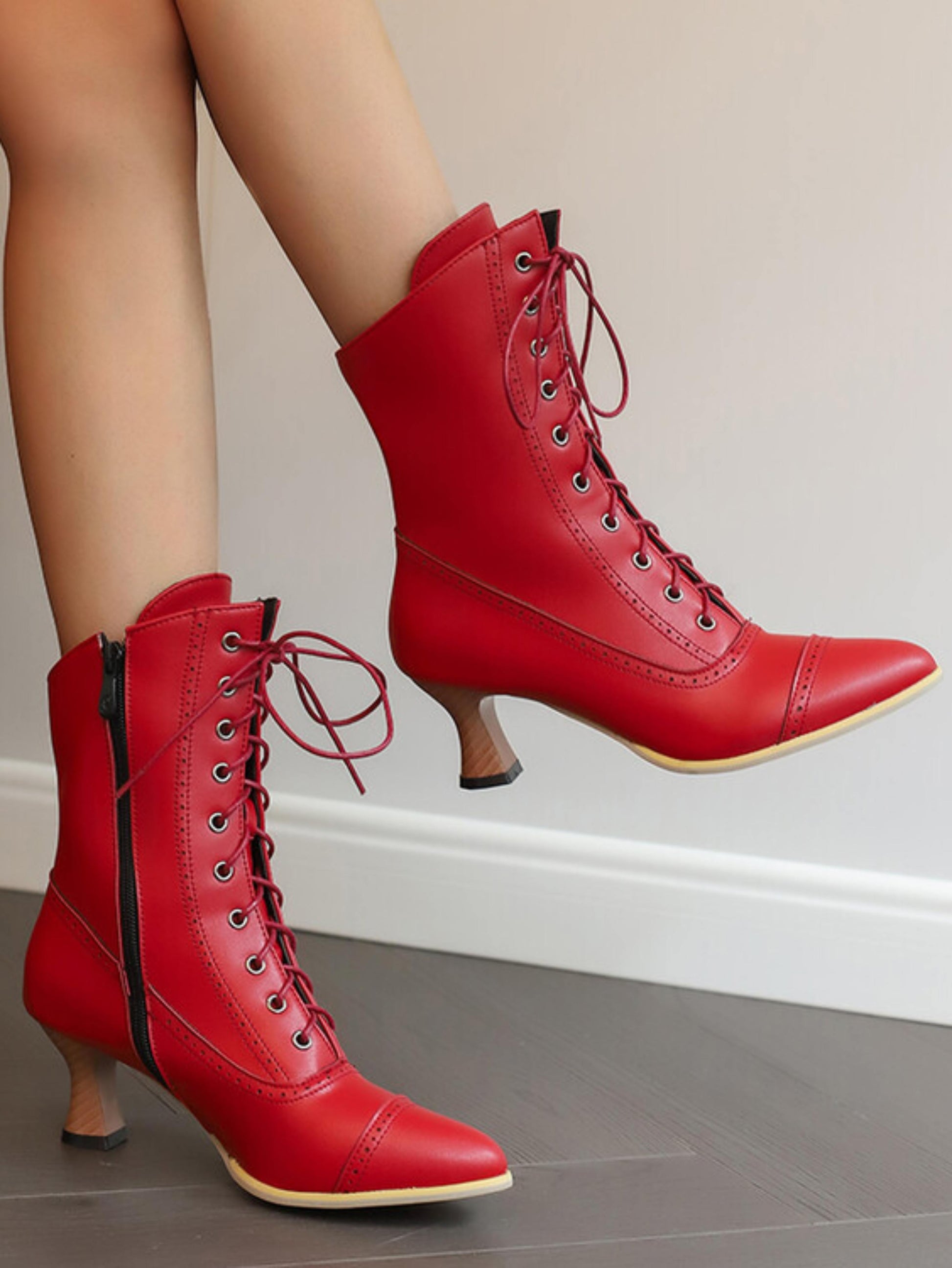 Turn heads with these bold vintage-inspired lace-up boots. Designed in striking red faux leather, they feature refined brogue-style stitching, a rounded cap toe, and a flattering mid-calf cut. The lace-up closure ensures a secure fit, while the slim flared heel provides just the right amount of lift for comfort and elegance all day long.