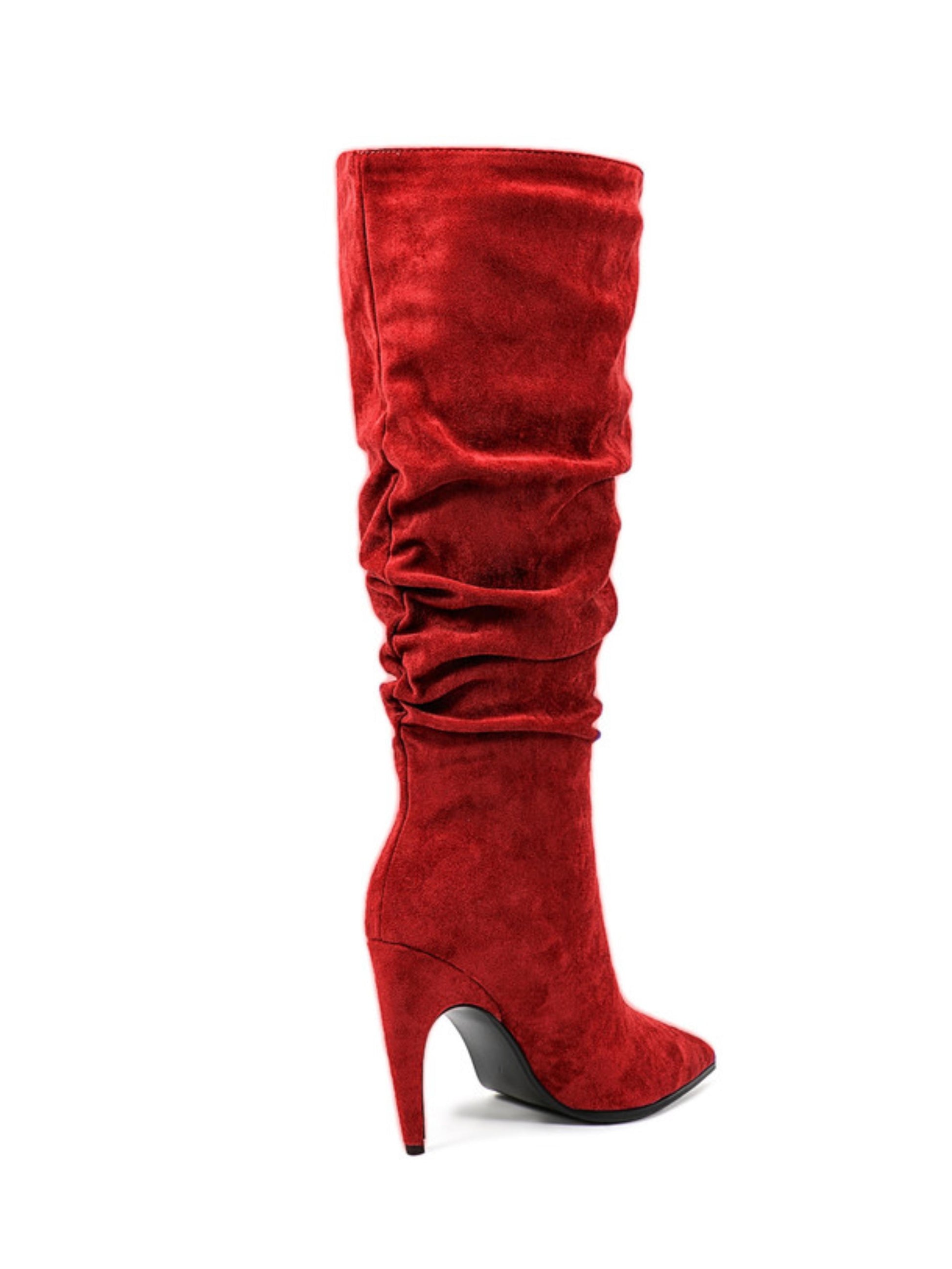 Make a striking statement with these crimson red suede knee-high boots. Designed with a sleek pointed toe and high stiletto heel, they effortlessly combine bold elegance and sultry allure. The slouchy, slip-on style ensures comfort without sacrificing style. Elevate your wardrobe with a pair that commands attention wherever you go.