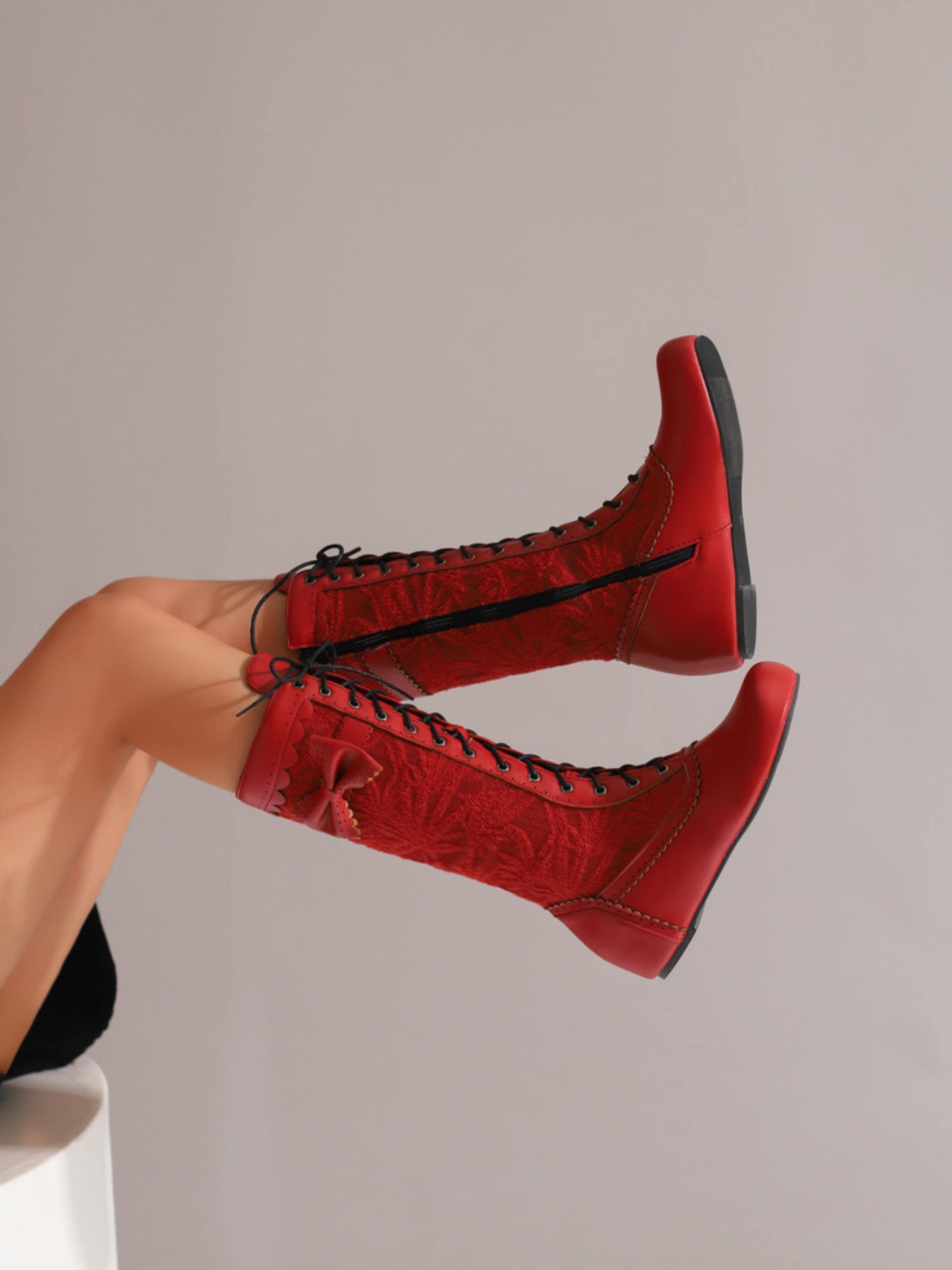 Add a playful yet elegant touch to your style with these charming red mid-calf boots. Designed with a lace-up front and convenient side zipper, they feature a rounded toe, a low heel for all-day comfort, and a delicate bow accent at the top for a feminine finish. The subtle textured detailing on the shaft enhances their unique, fashion-forward appeal.