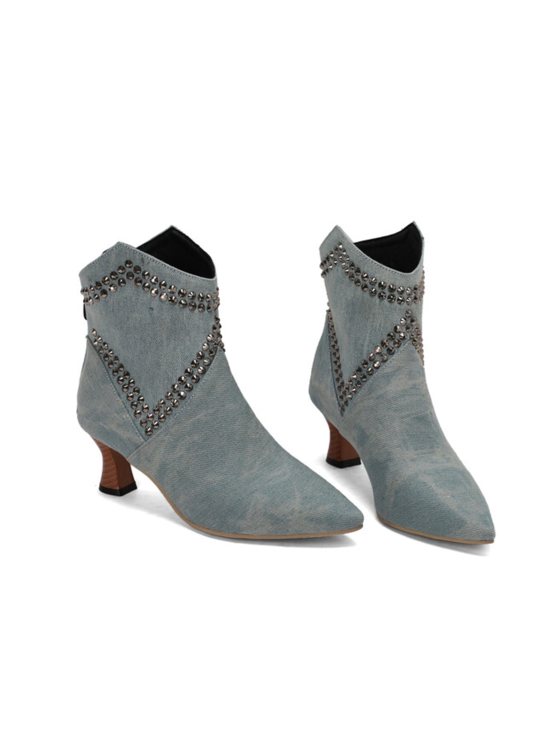 Rhinestoned Denim Blue Mid Heel Ankle Boots for Women