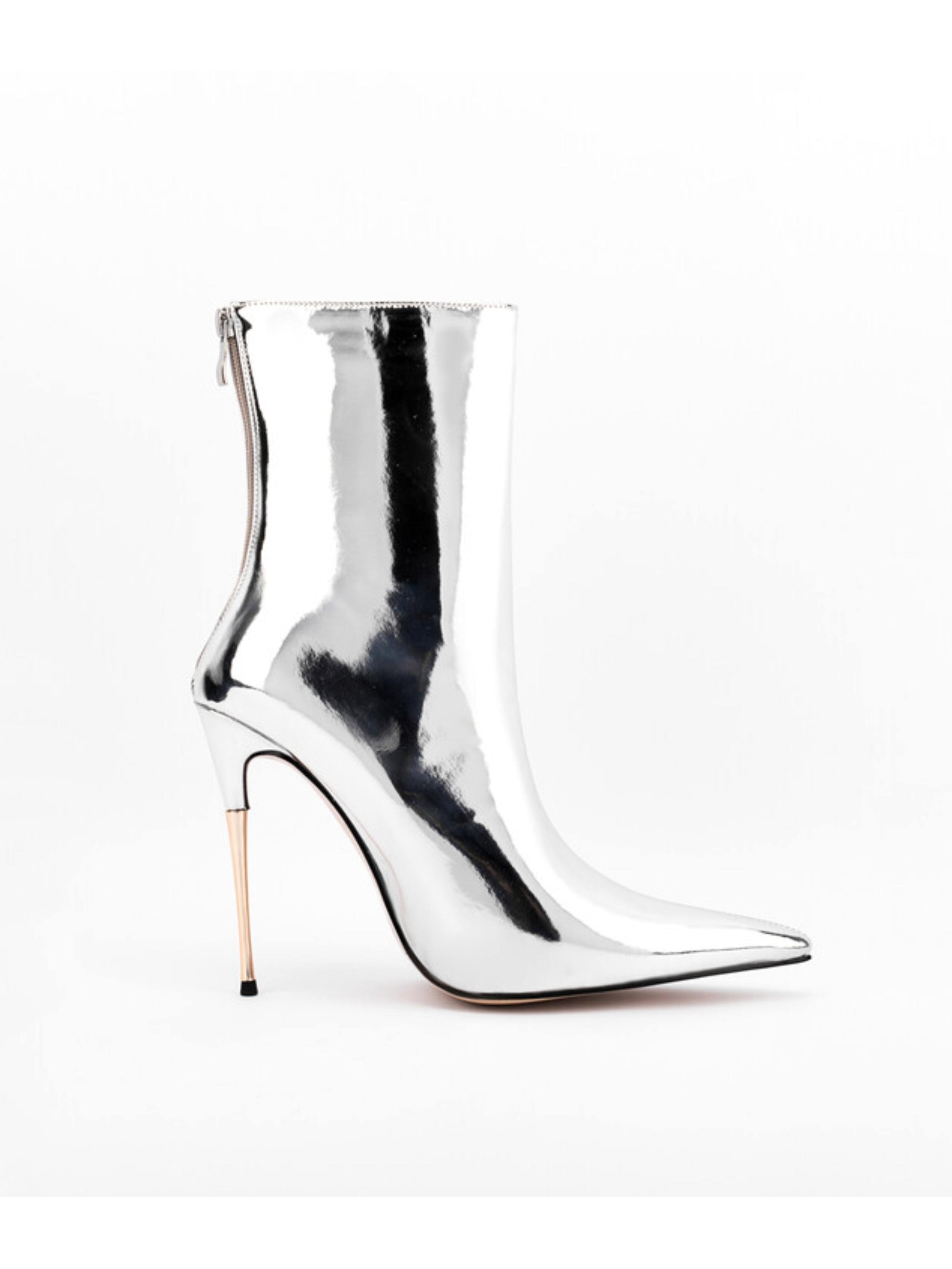 Stand out boldly in these Silver Mirror Leather Finish Ankle Boots for Women. With an ultra high stiletto heel and sharp pointed toe, they command attention and exude fearless style. The back zipper offers a secure fit, making these boots the ultimate daring statement piece to elevate your wardrobe.