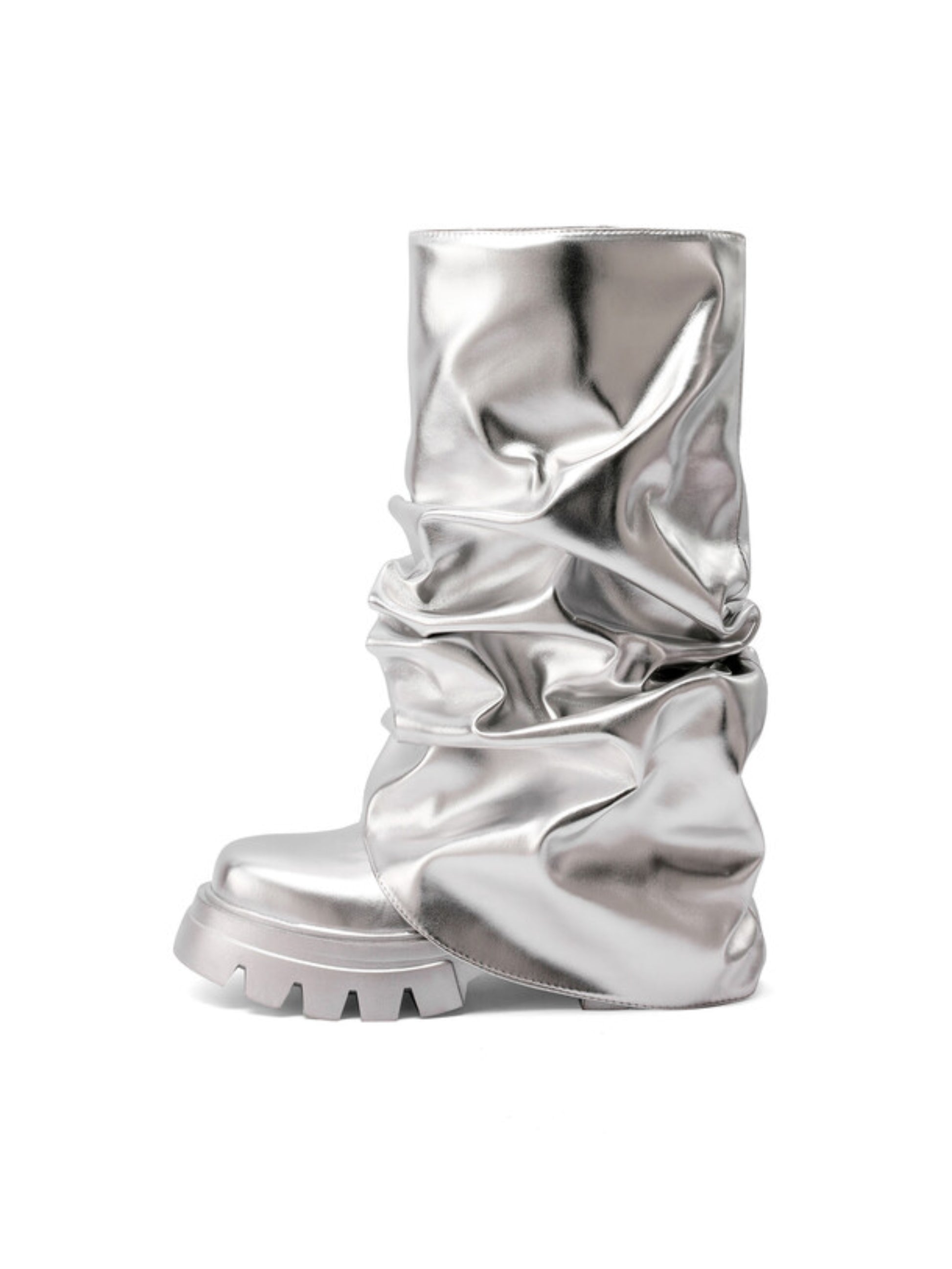Step into bold sophistication with these striking silver mirror leather long boots. Featuring a lustrous mirror finish that catches every light, they command attention with their slouchy silhouette and rounded toe for all-day comfort. The hidden chunky platform provides confident height while the mid heel keeps you grounded and in control. Slip them on effortlessly and own the room—these statement boots transform any outfit into an unforgettable look.